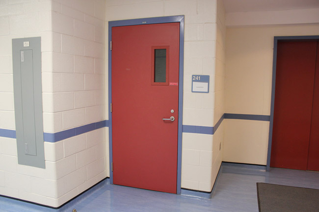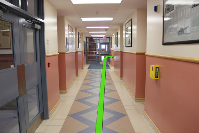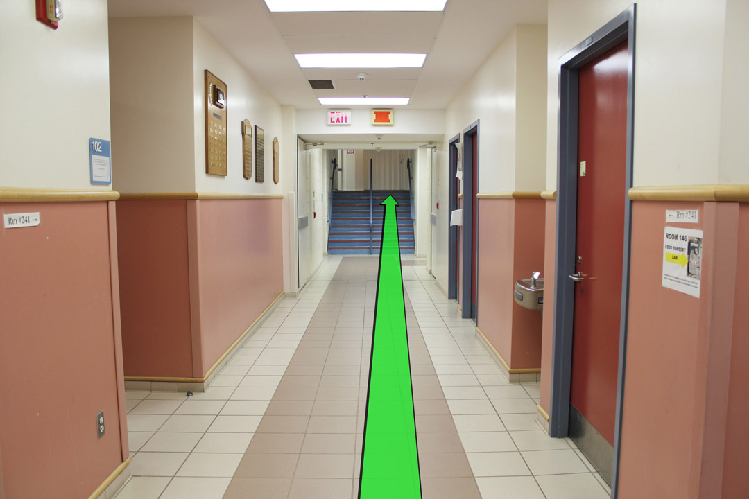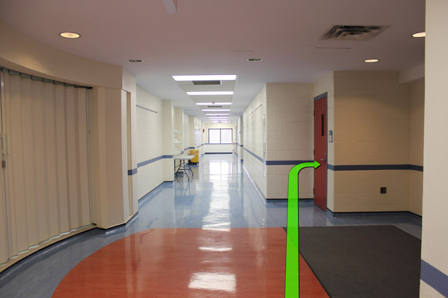 As you enter the building walk down the hallway on your left, then take a right turn down the hallway up ahead.