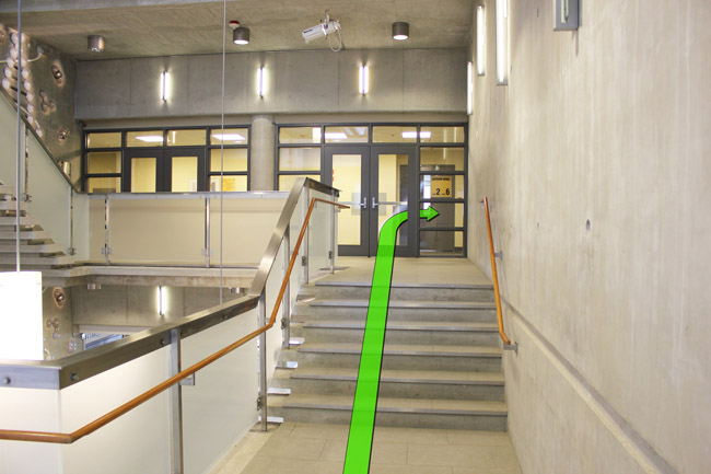 On entering the building, walk up the stairs to the 2nd Level.