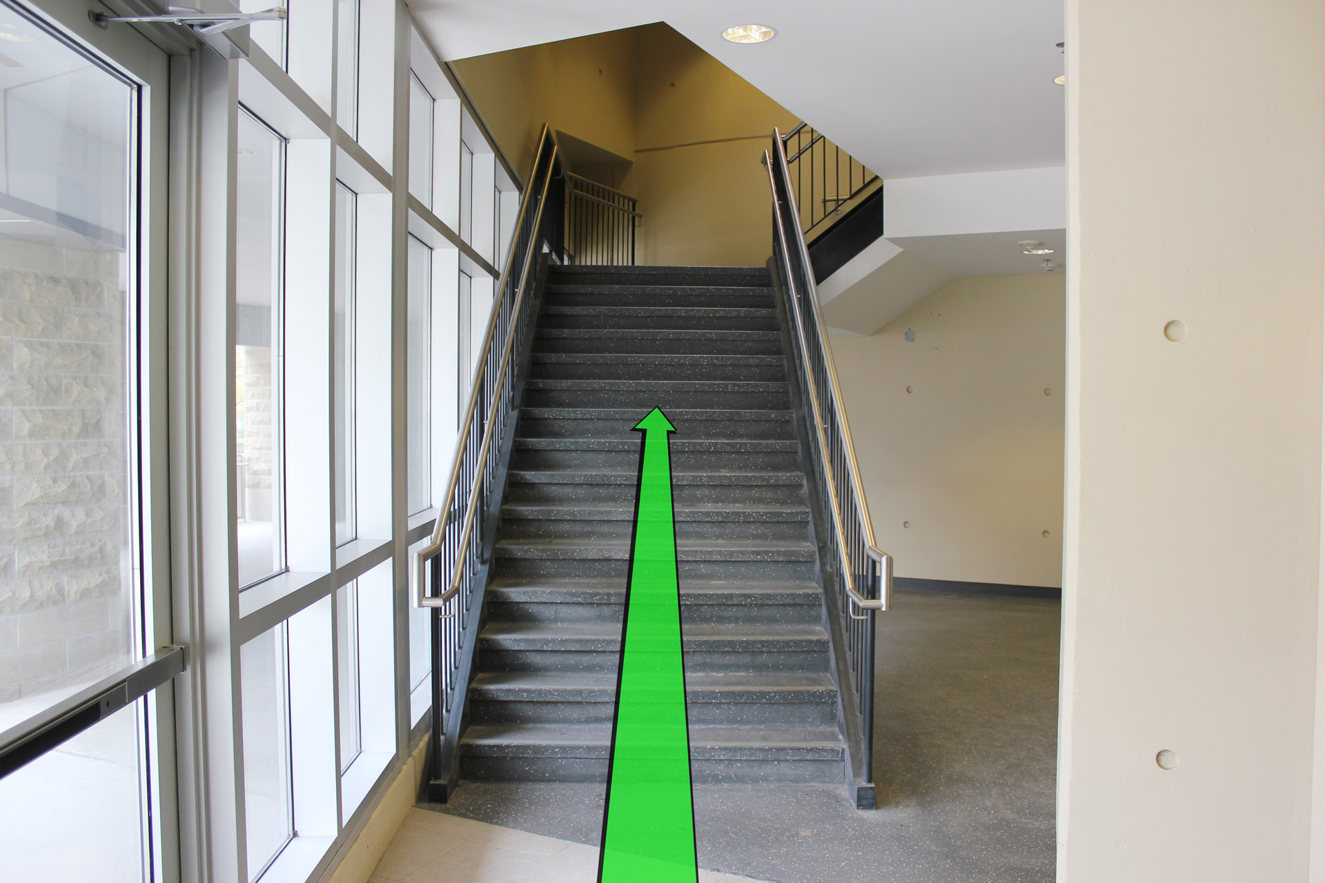 On entering the building, walk up the stairs to the 2nd Level.