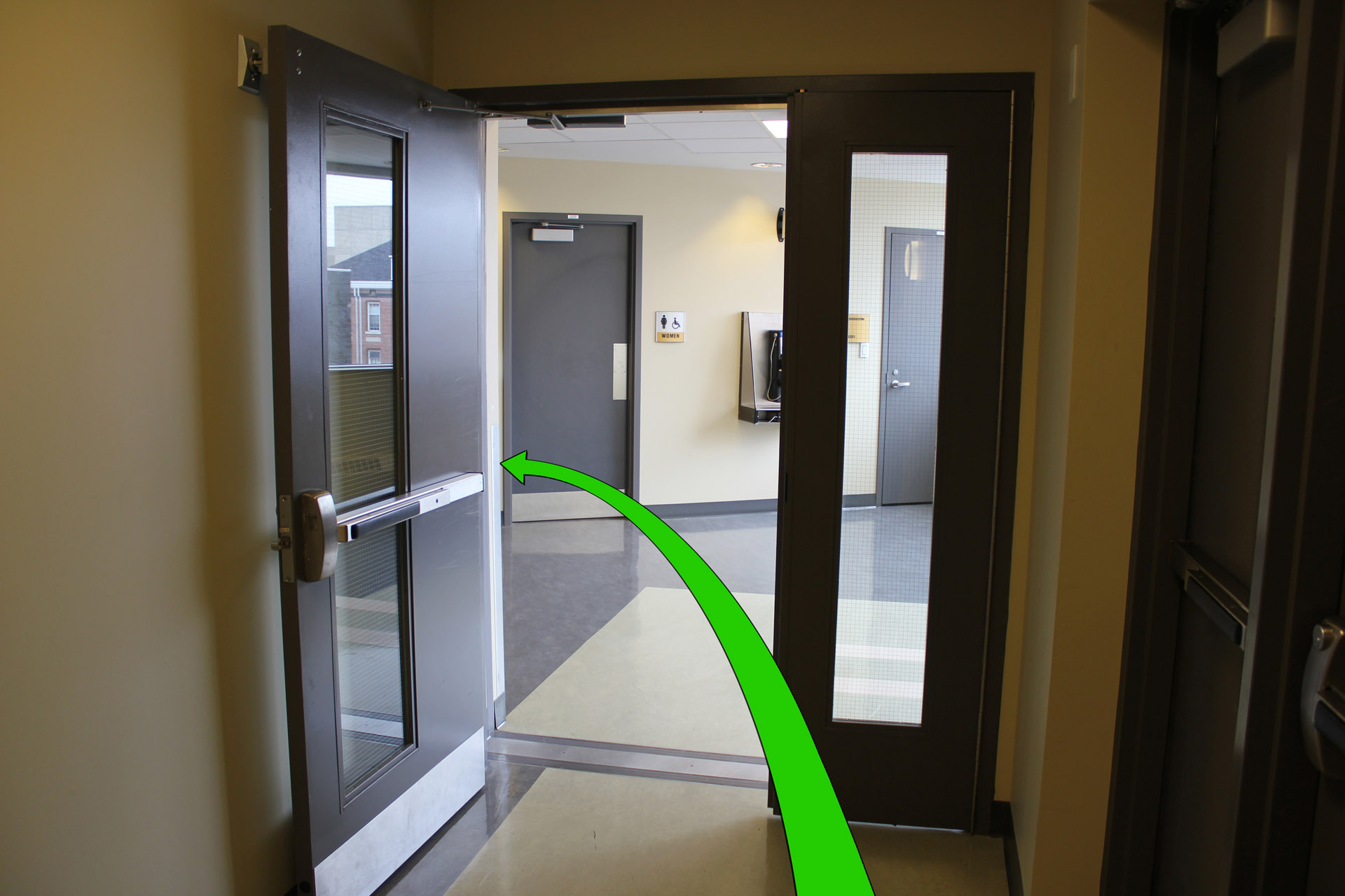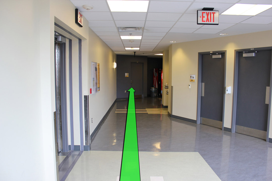 Exit the stairway to your right and take a left turn down the hallway.