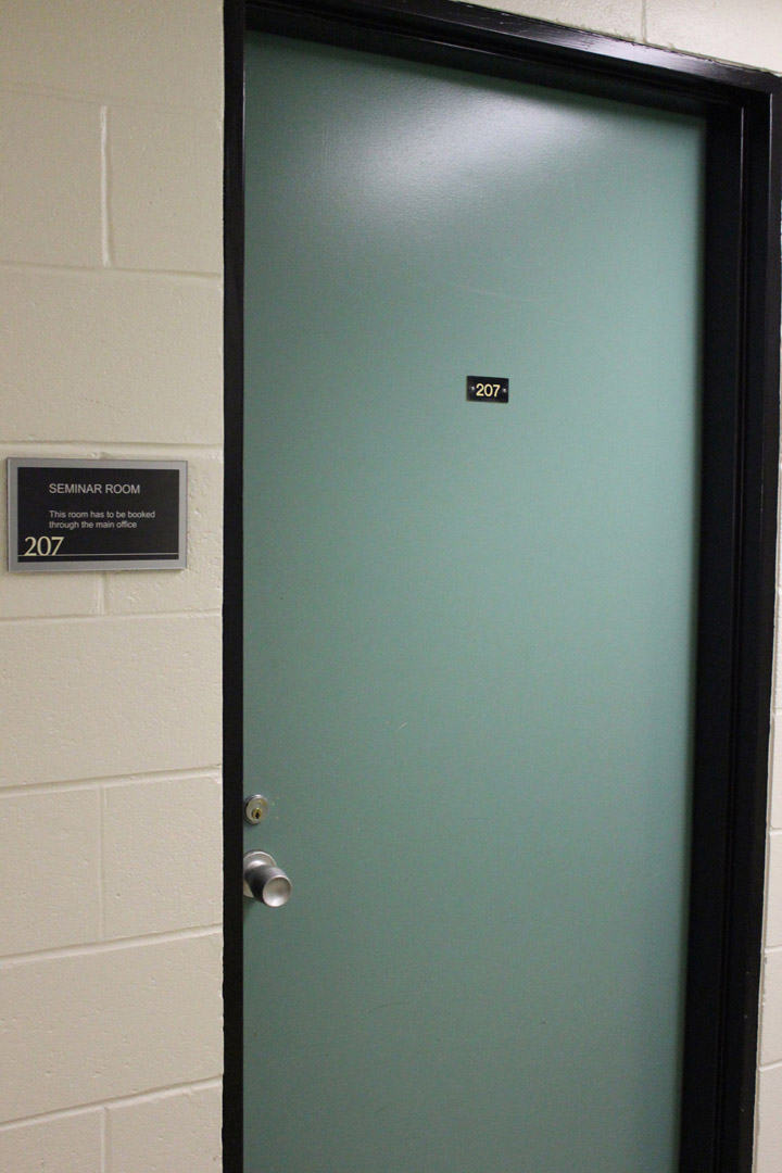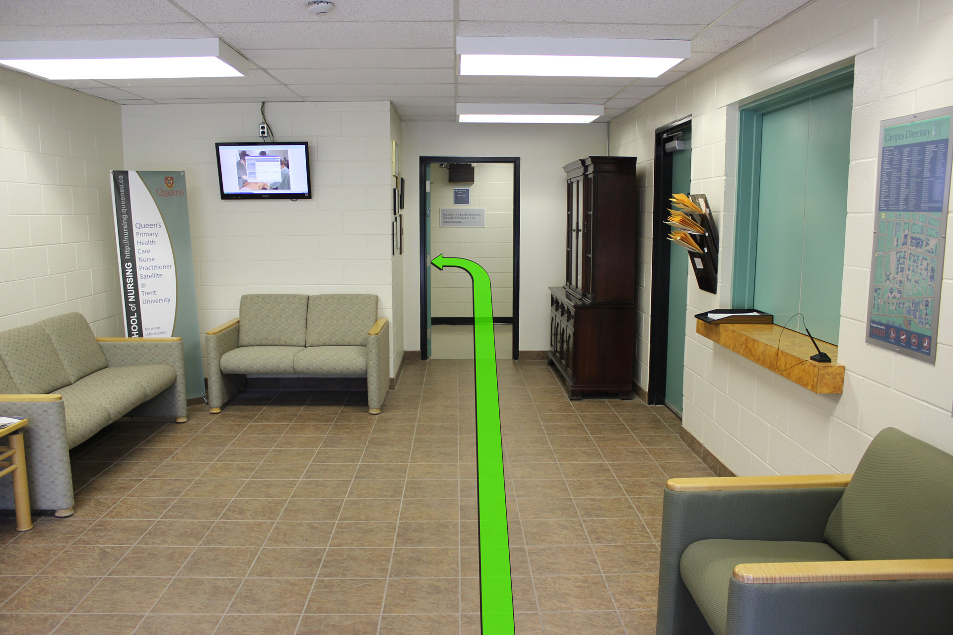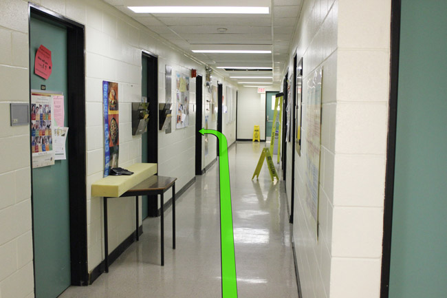 On entering the building walk straight and take a left turn down the hallway up ahead.
