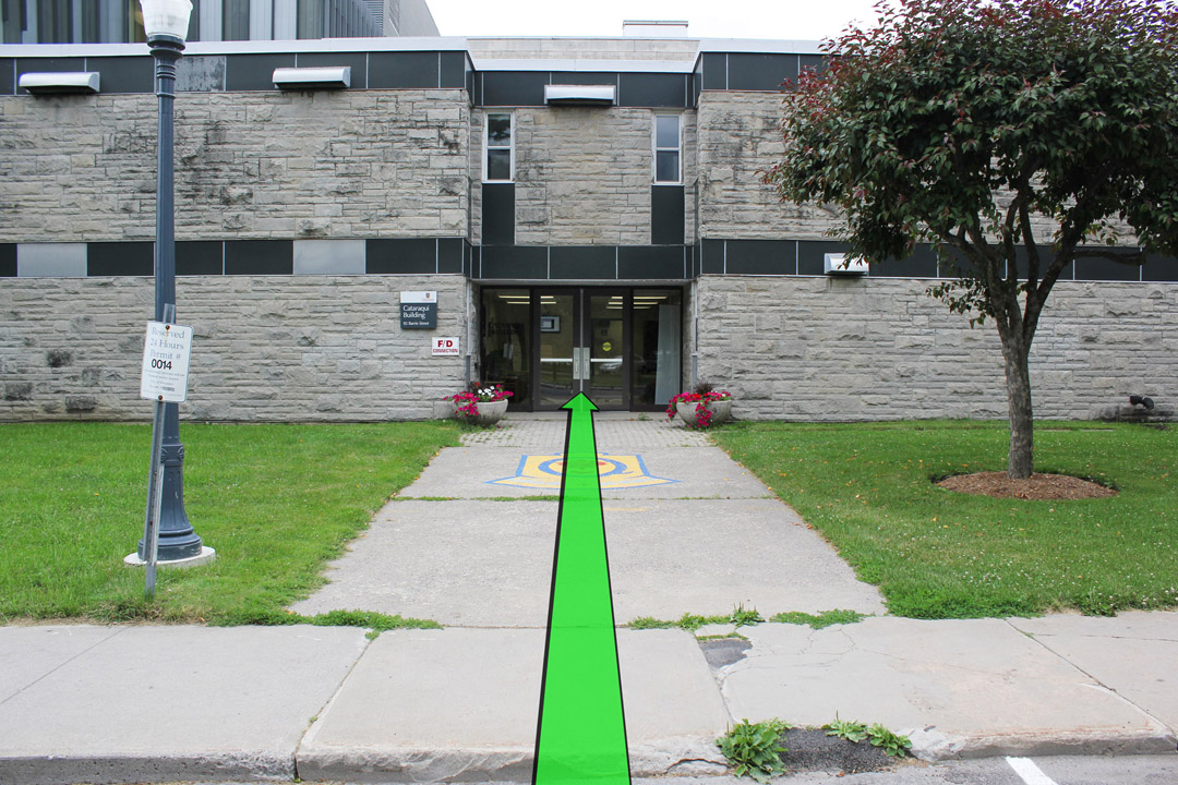 Walk from the street to the entrance of the Cataraqui Building. Enter the building.