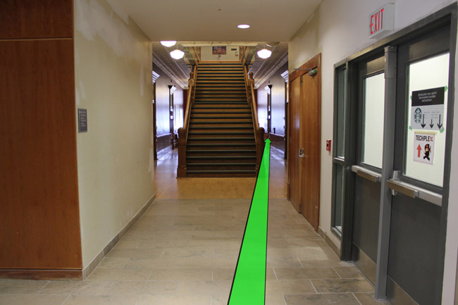 On entering the building turn left and walk straight towards the hallway up ahead. Take a left turn down the hallway.