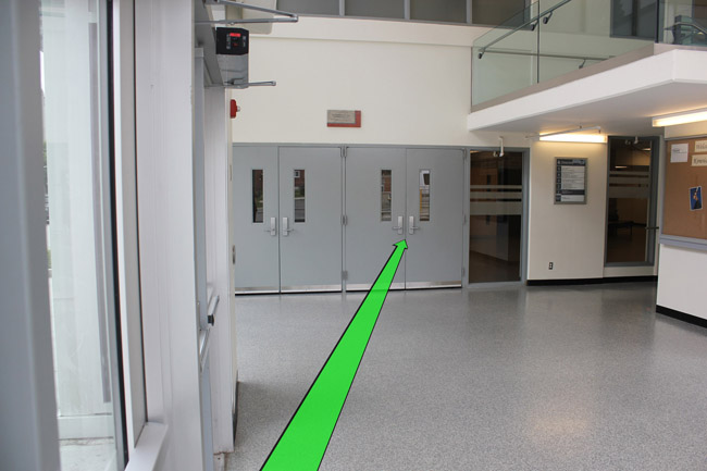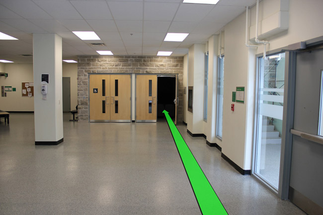 On entering the building walk towards the doors on your left. Enter the hallway.