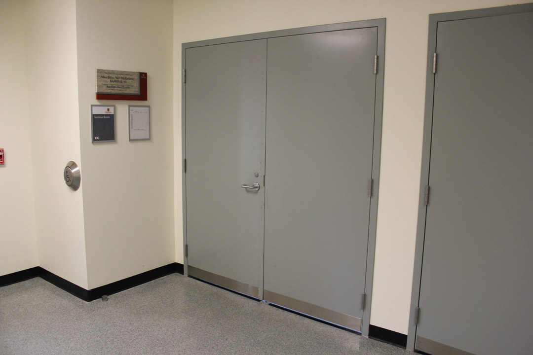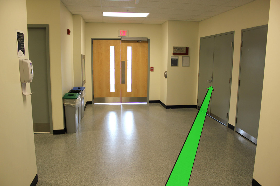 On entering the building walk towards the doors on your left. Enter the hallway.
