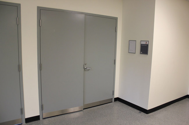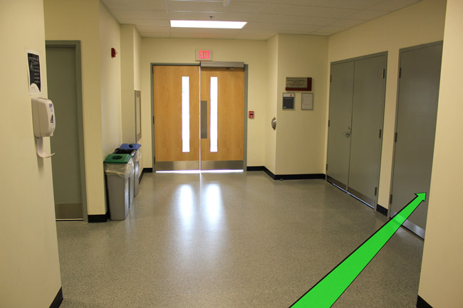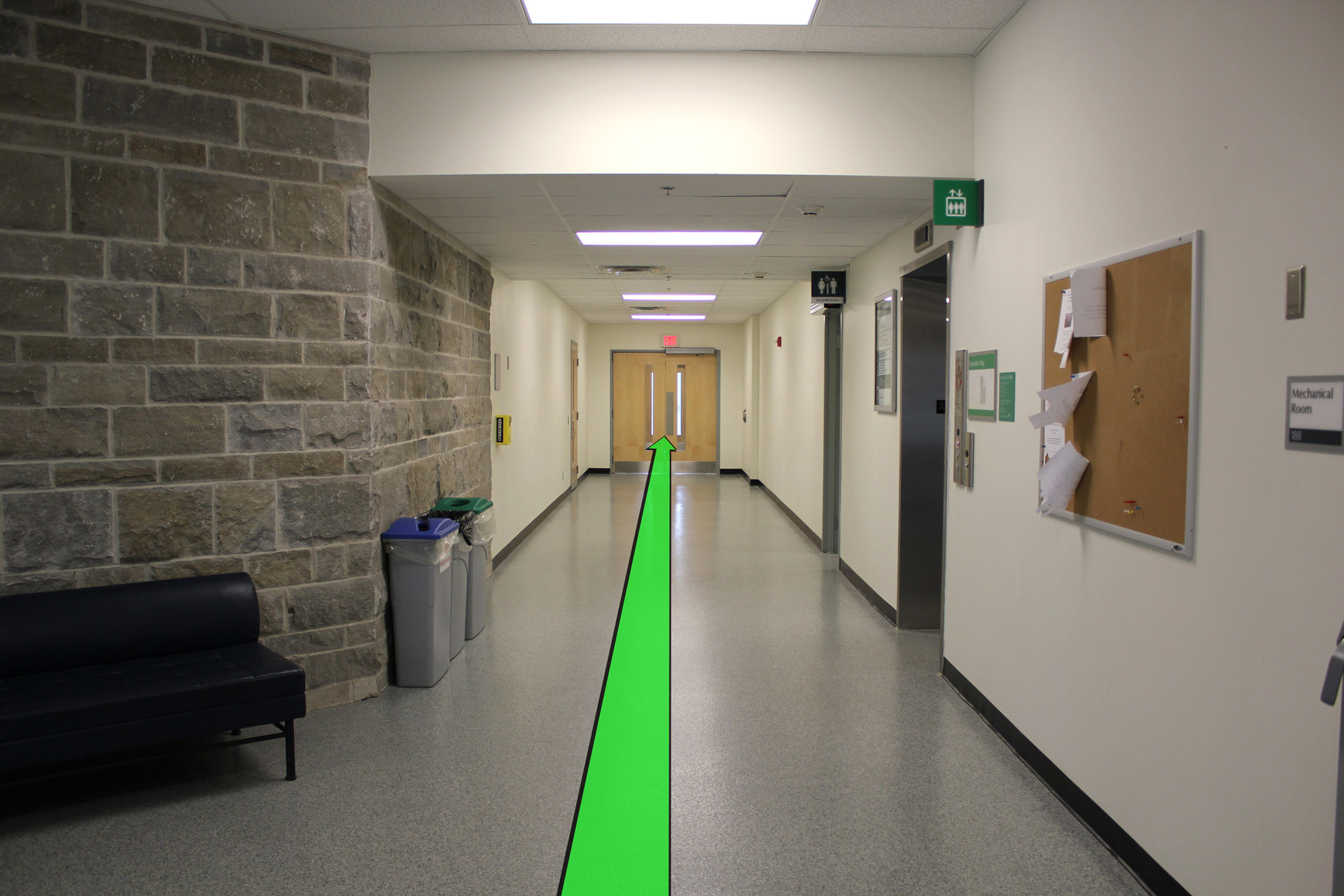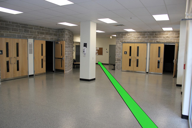 On entering the building walk towards the doors on your left. Enter the hallway.