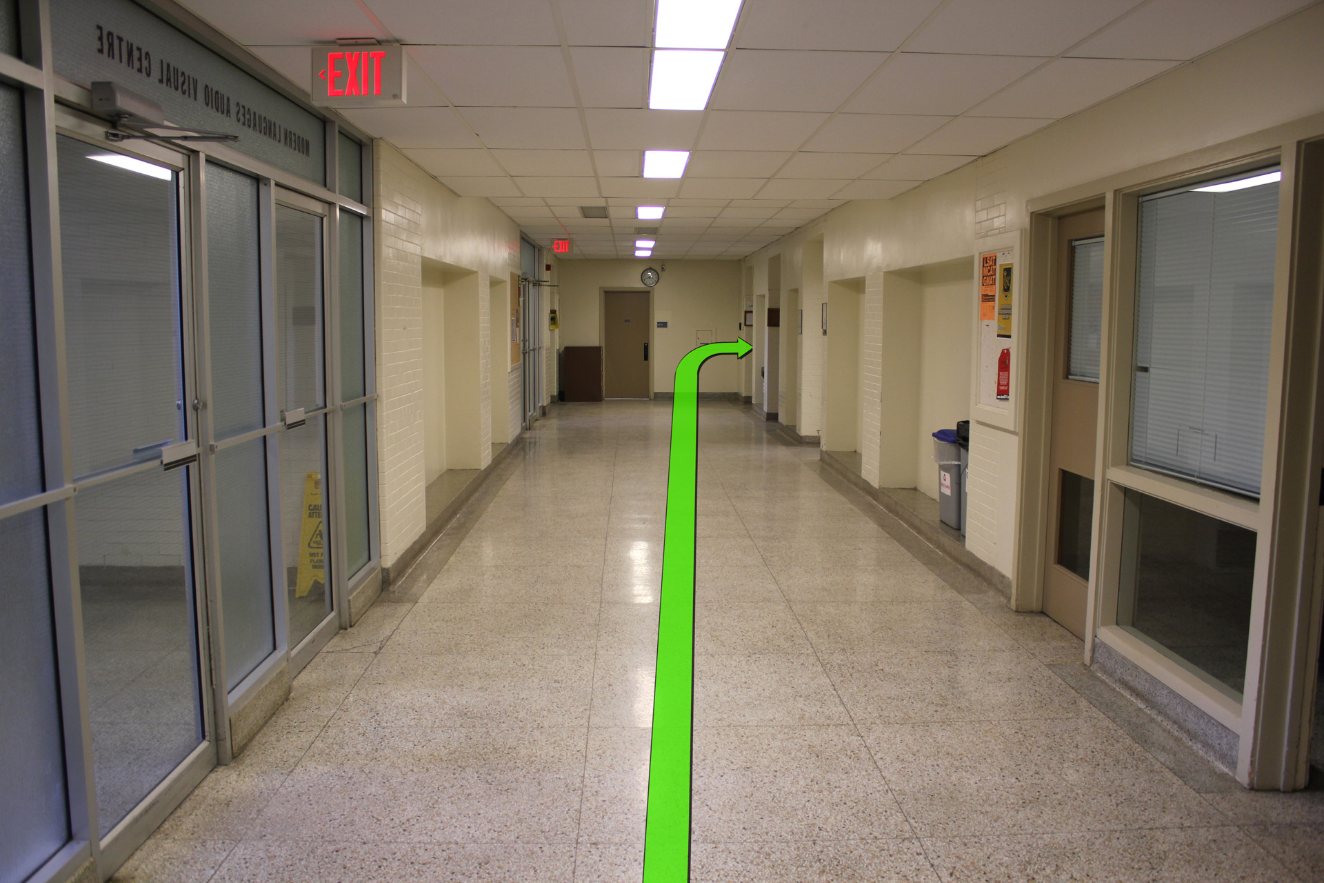 Walk upstairs towards the hallway doors straight ahead and enter the hallway.