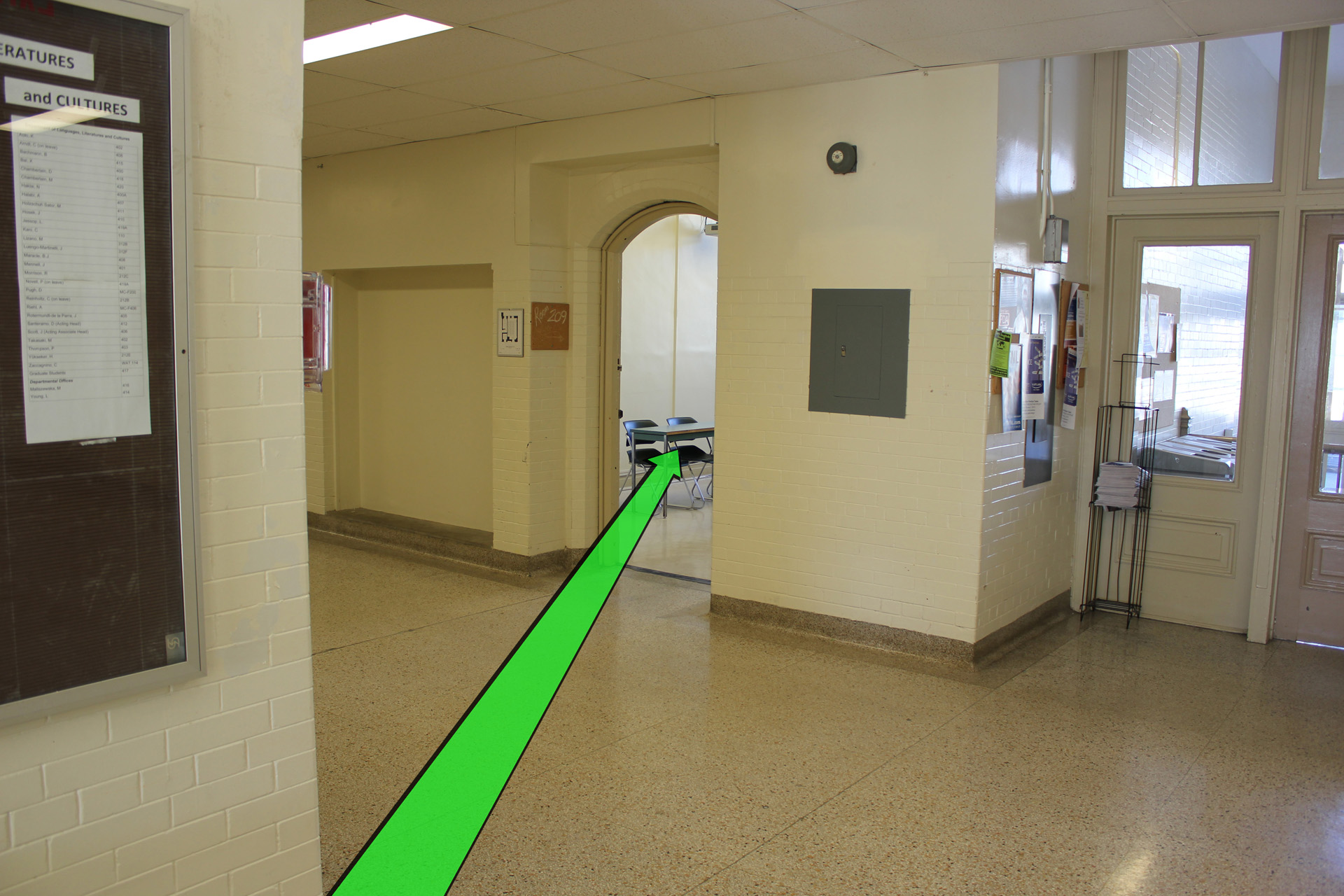 Walk upstairs towards the hallway doors straight ahead and enter the hallway.
