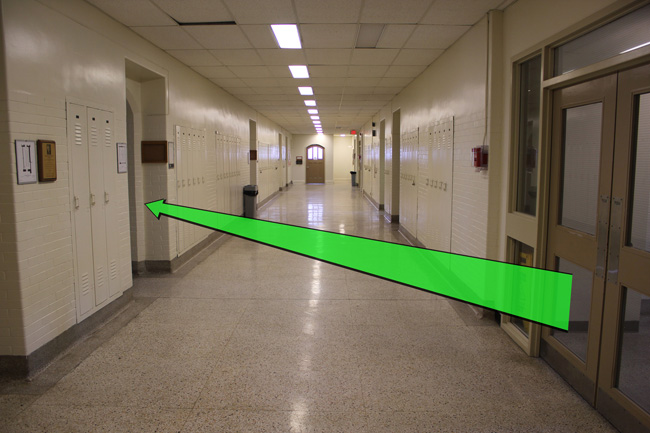 Walk upstairs towards the hallway doors straight ahead and enter the hallway.