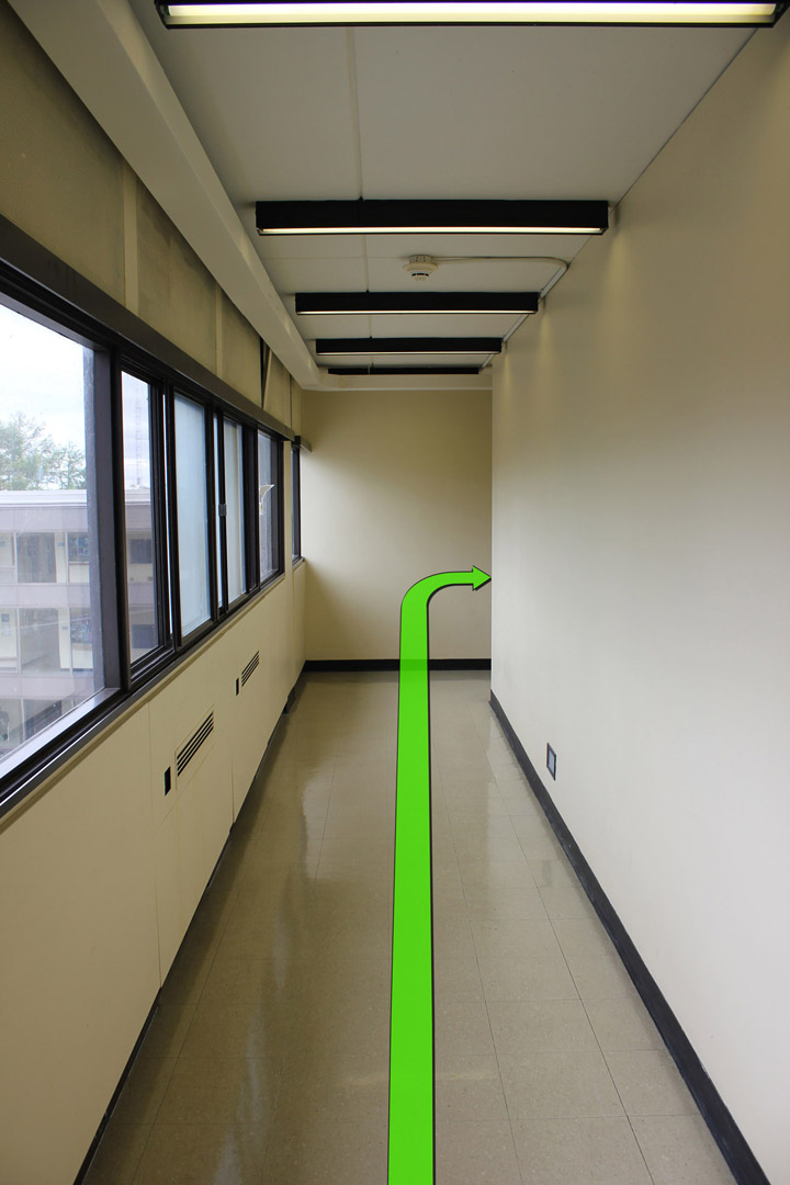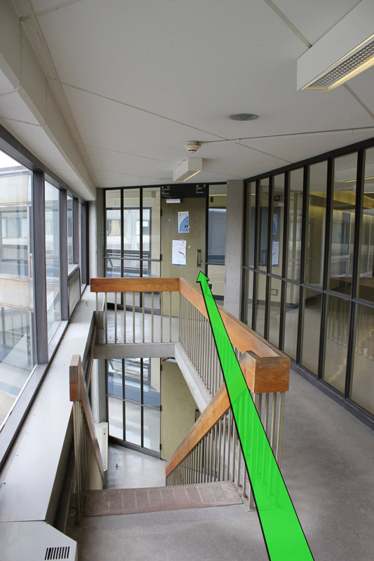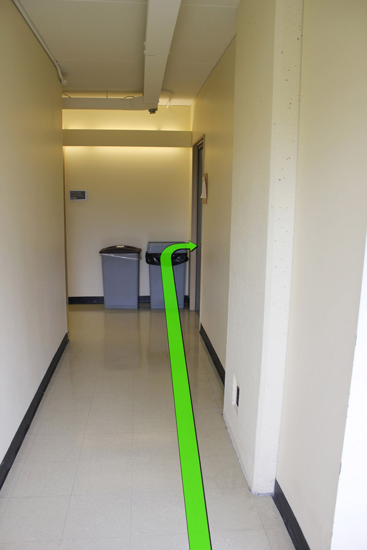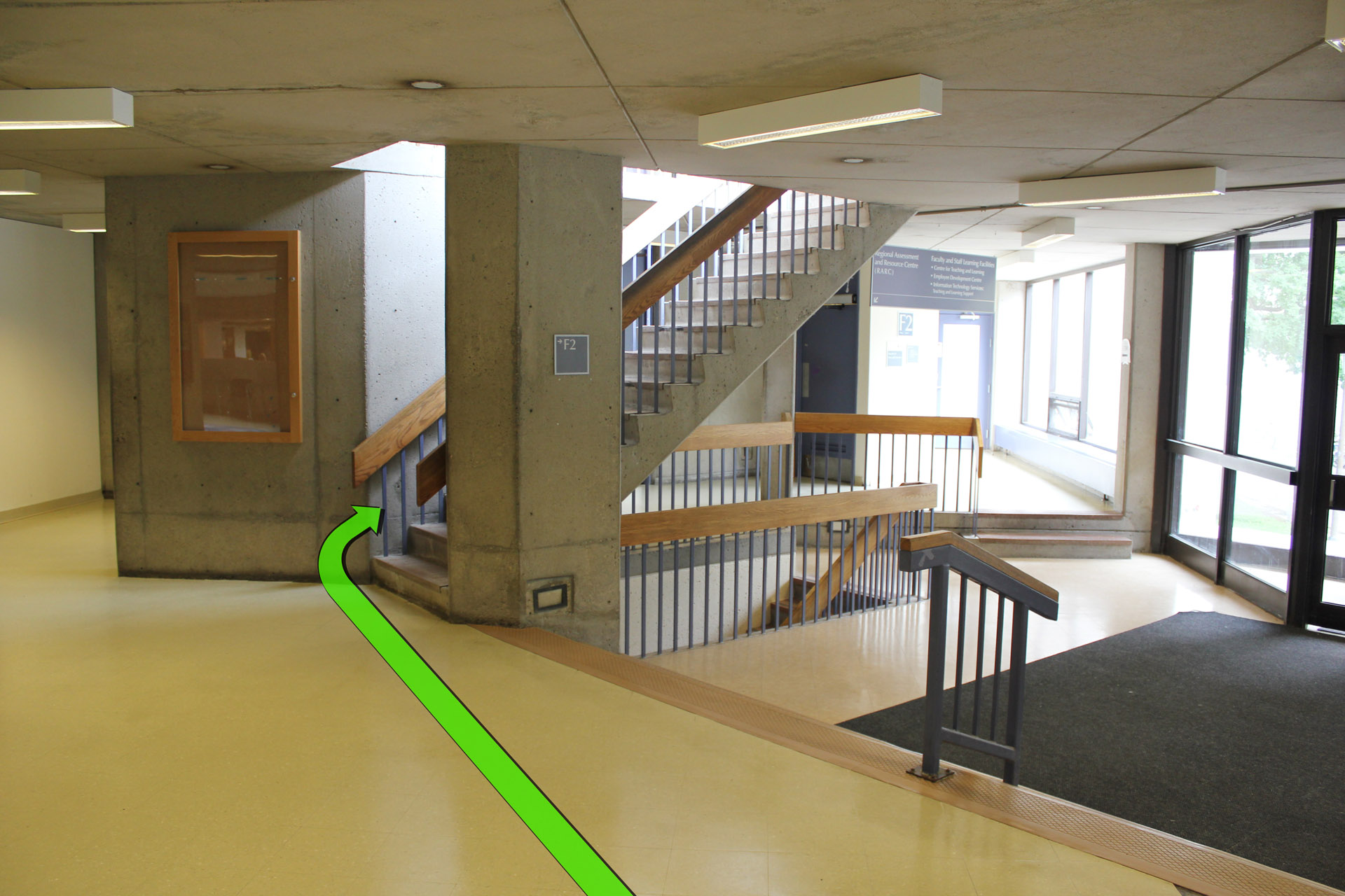 On exiting the stairway walk straight down the hallway on your left. Take a left turn at the first hallway up ahead.
