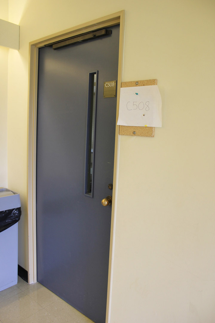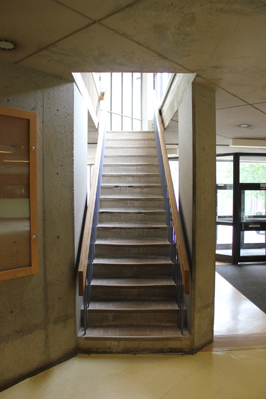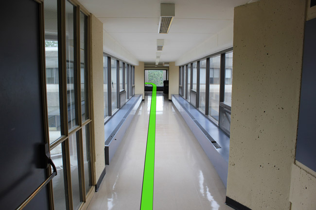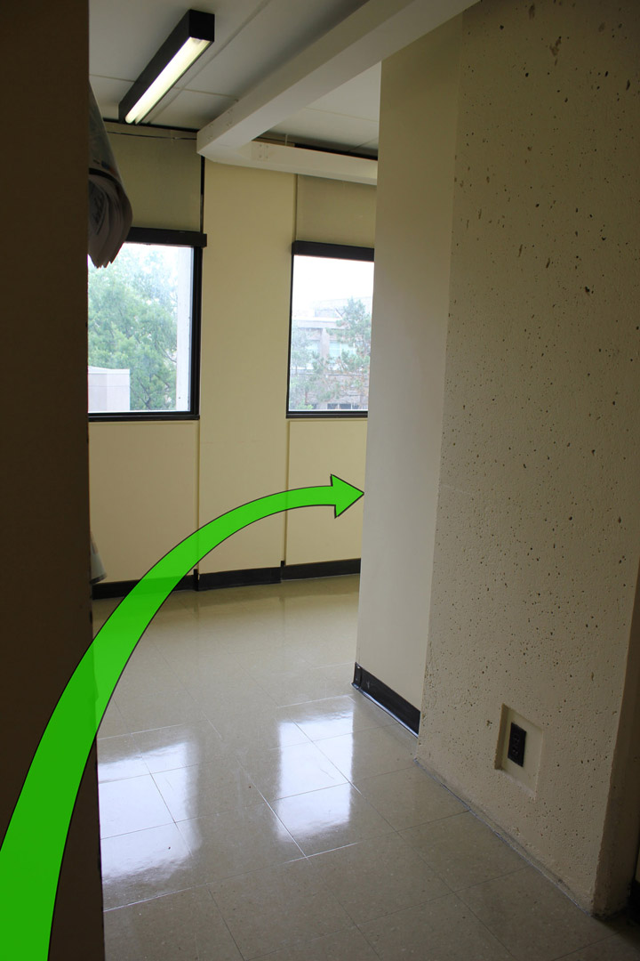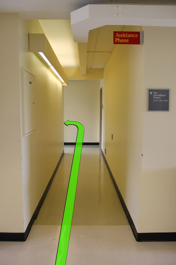 On exiting the stairway walk straight down the hallway on your left. Take a left turn at the first hallway up ahead.
