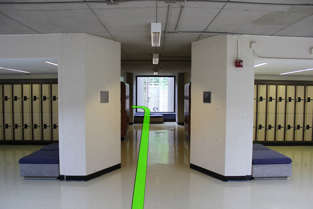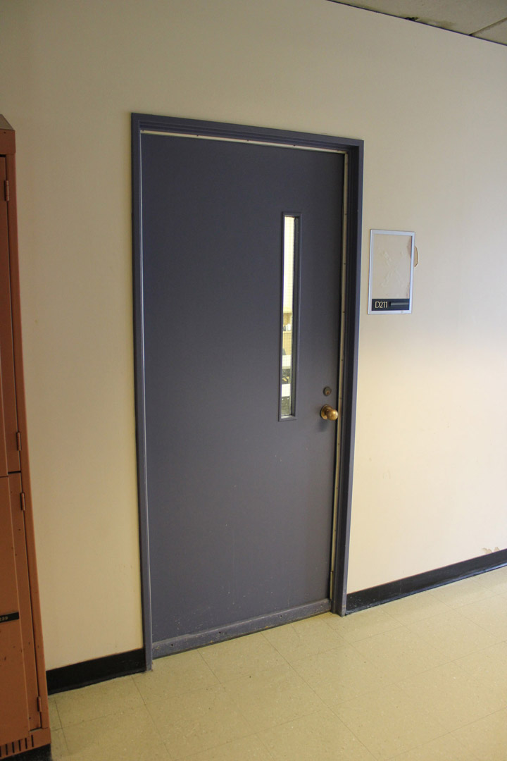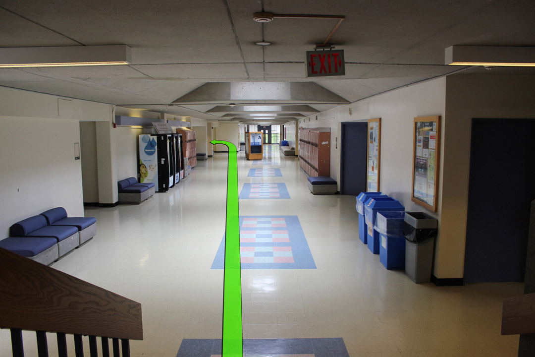 On entering the building walk straight down the hallway on your left. Take a left turn at the hallway up ahead.