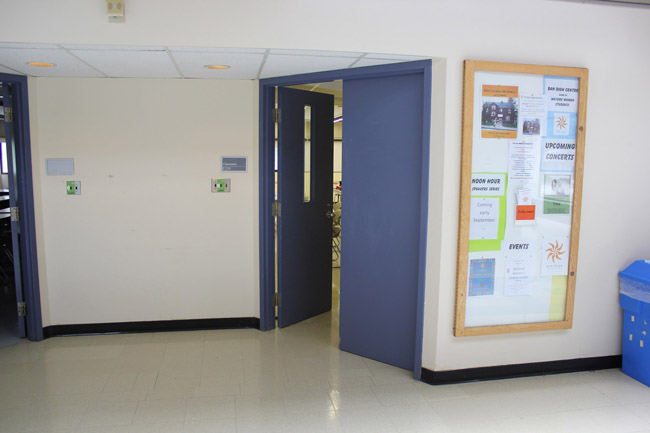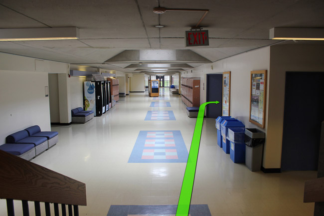 On entering the building walk straight down the hallway on your left. Take a left turn at the hallway up ahead.
