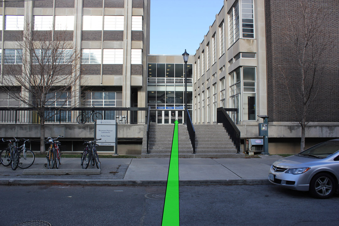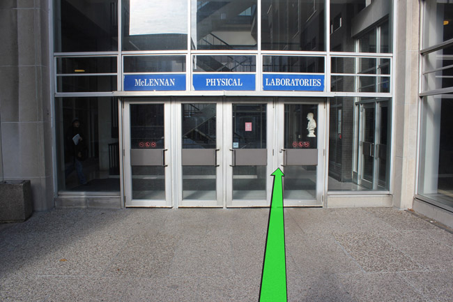 Walk from Russell Street towards the entrance of McLennan Physical Labs.