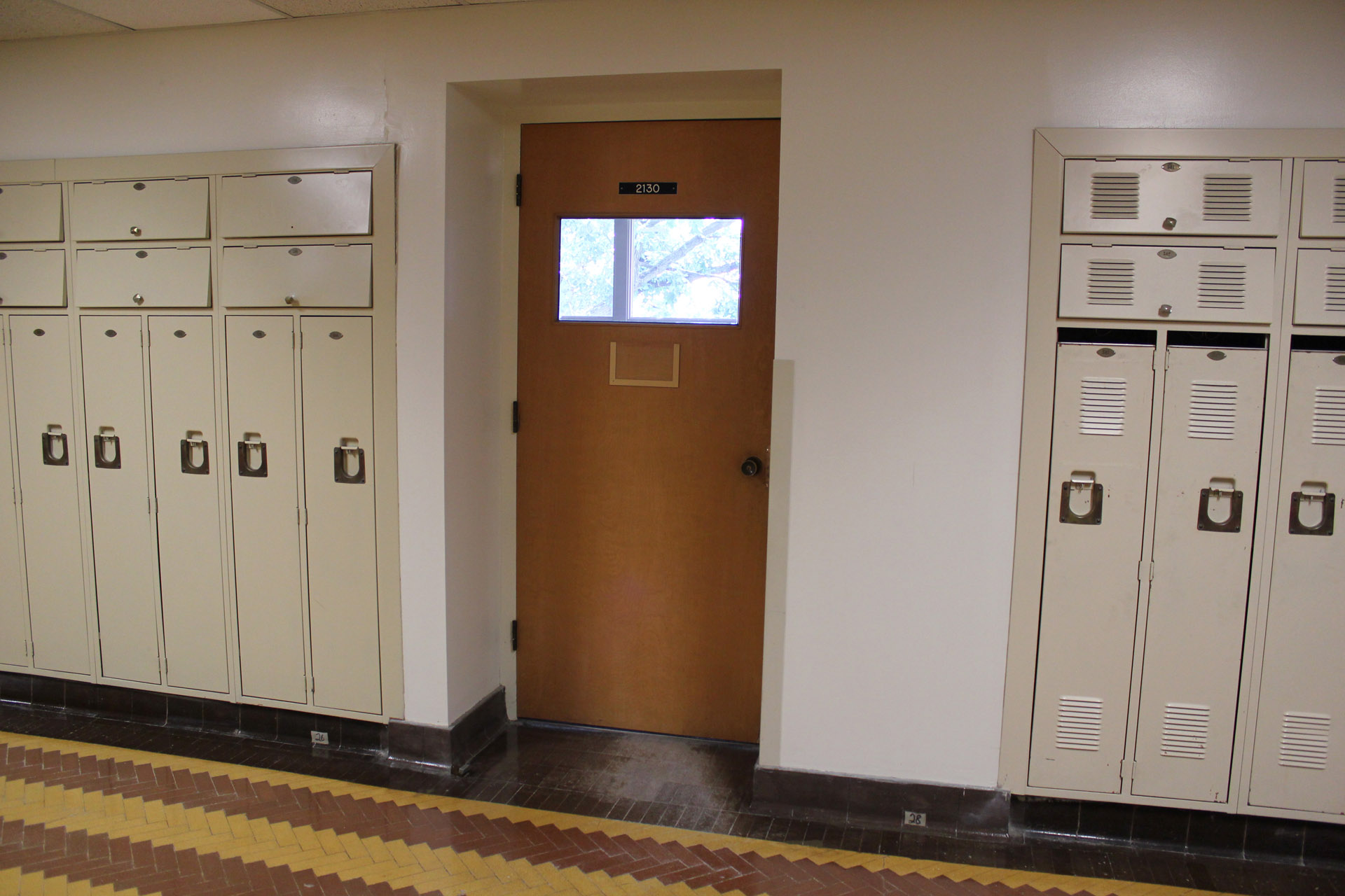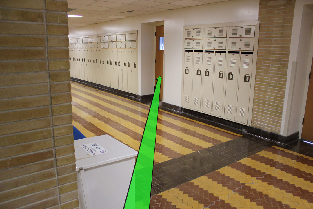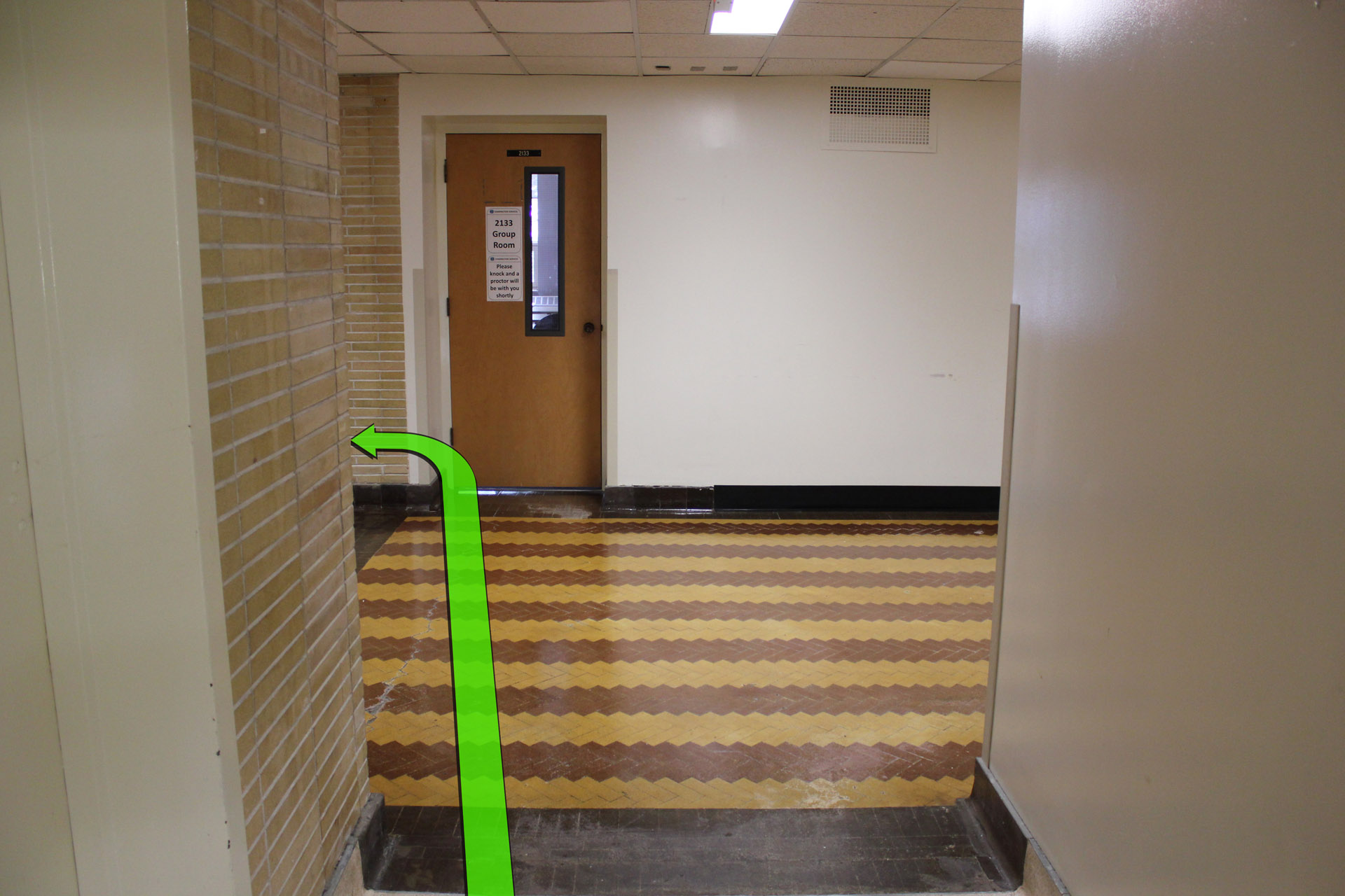 On entering the building walk straight down the hallway on your left towards the doors up ahead.