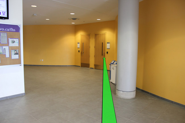 Once you are inside the building walk straight ahead and take a right turn at the staircase.