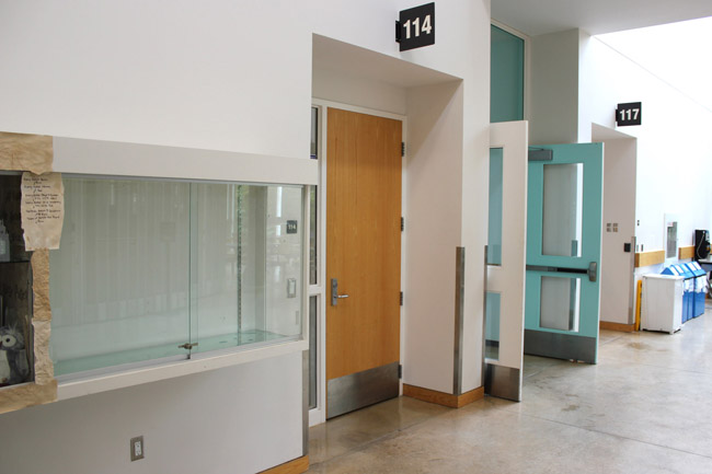 On entering the building walk straight down the hallway on your right.