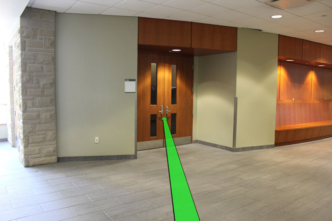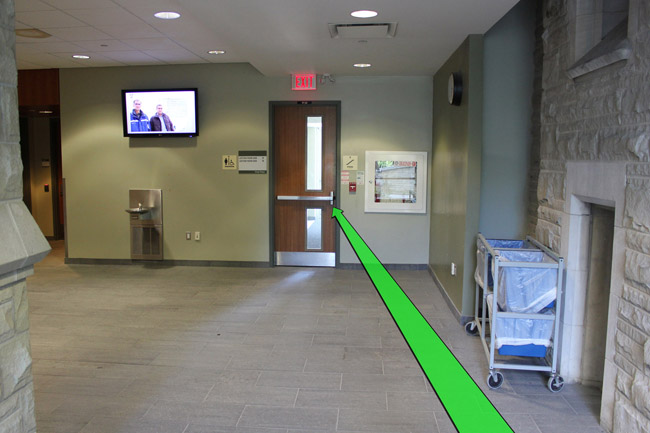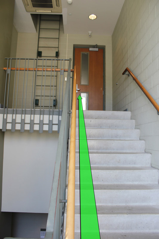 On entering the building open the door on your left (not pictured). Walk straight towards the stairway door up ahead and enter the stairway.