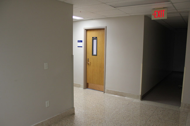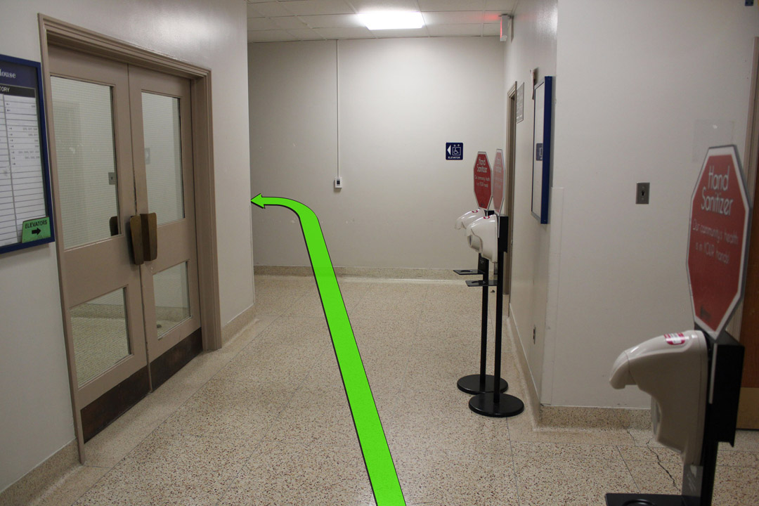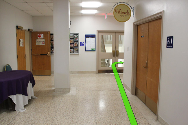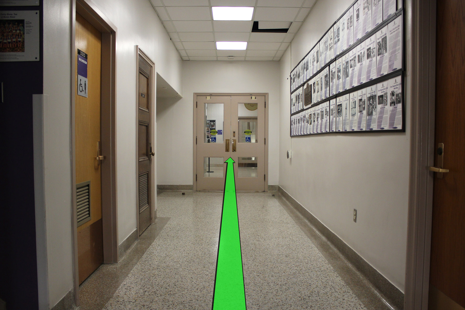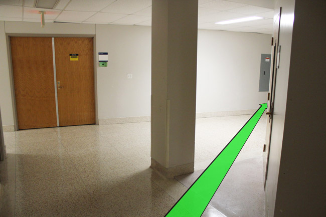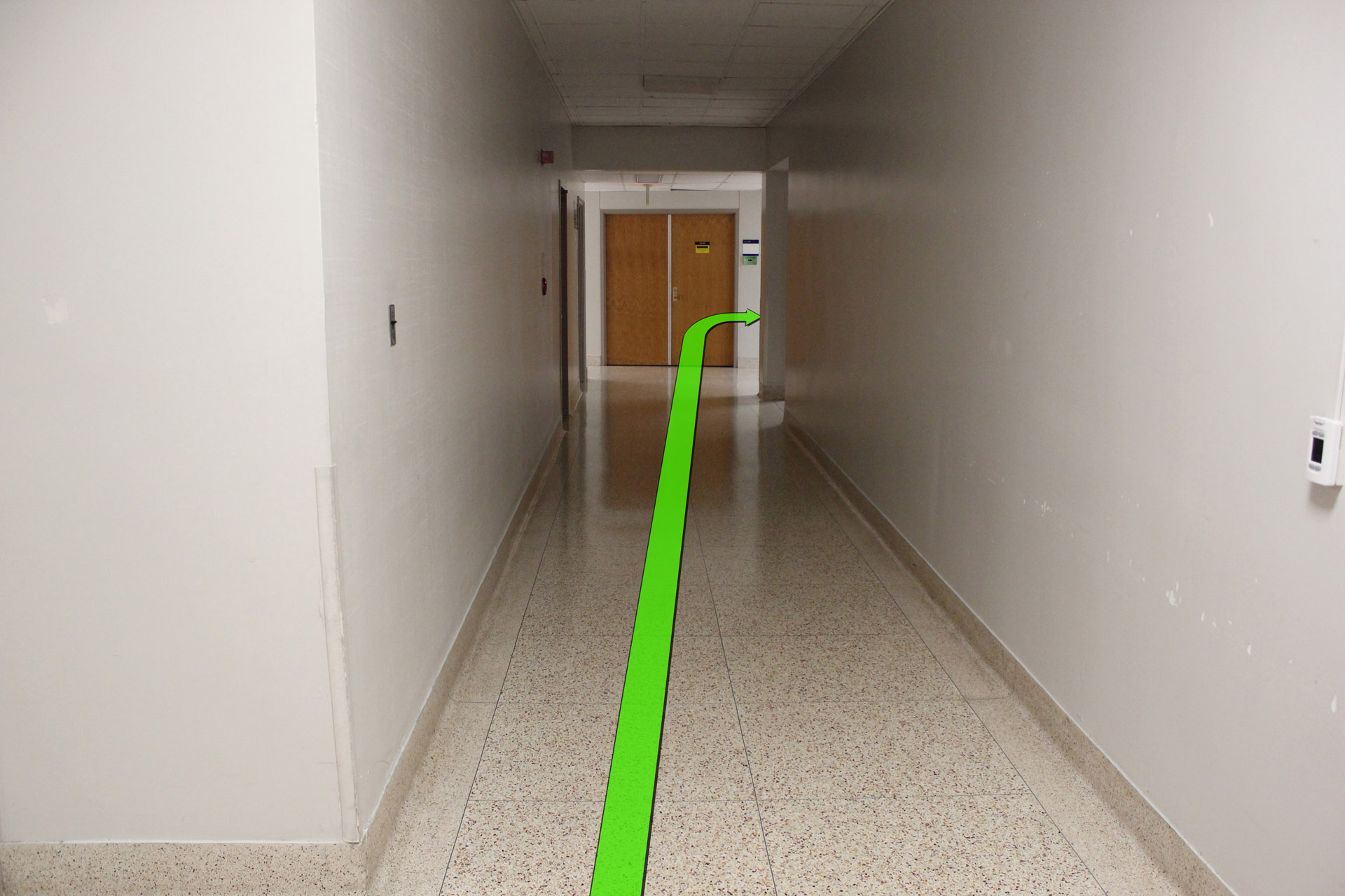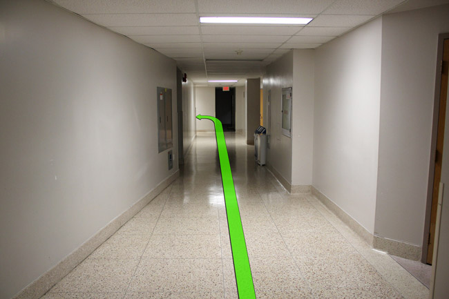 Take a right turn at the end of the hallway and walk down the next hallway.