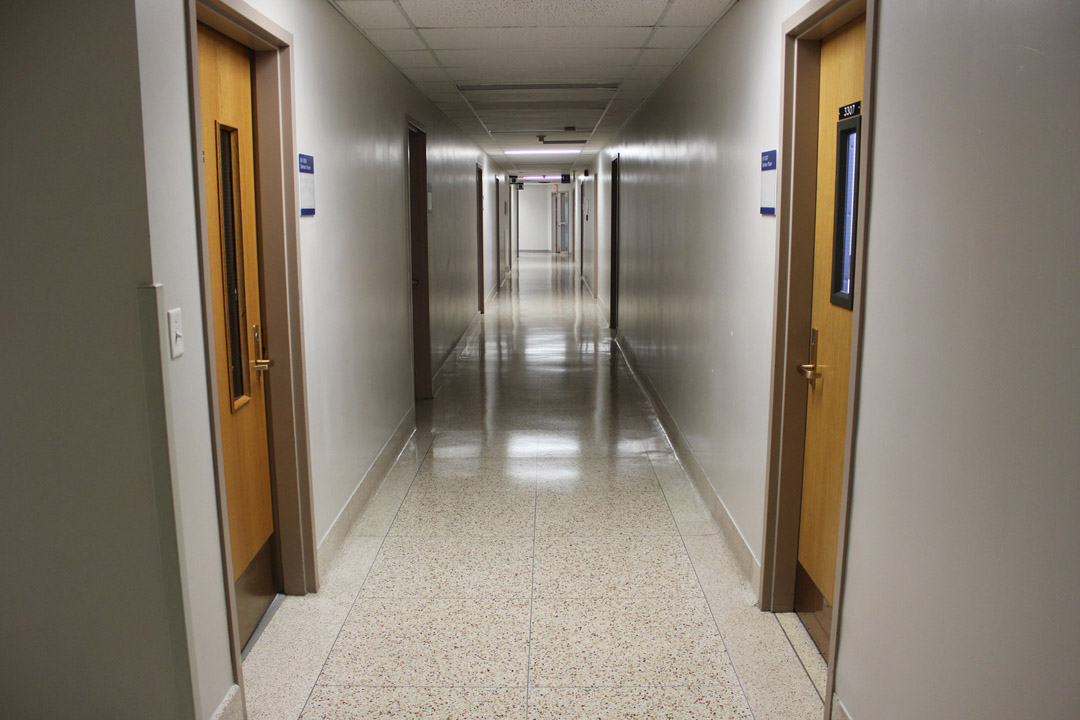 Take a right turn at the end of the hallway and walk down the next hallway.
