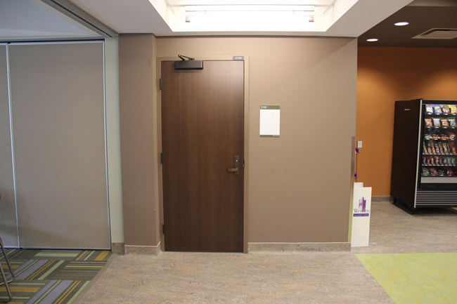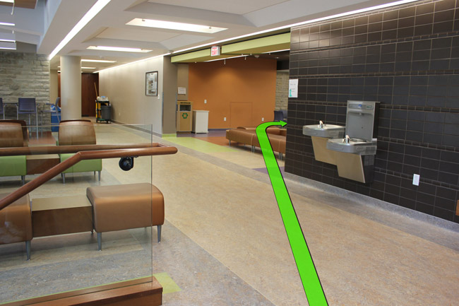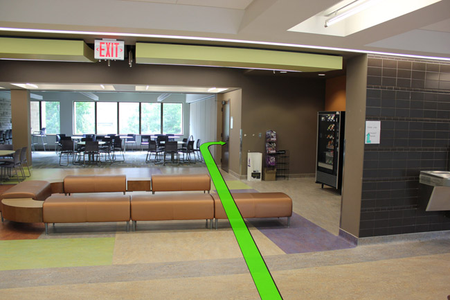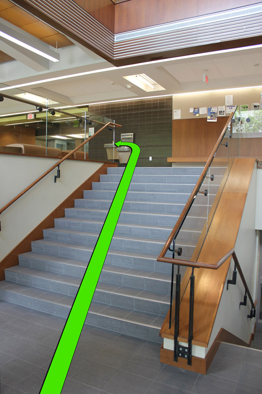 On entering the building walk up the stairs and take a left turn at the top of the stairs.