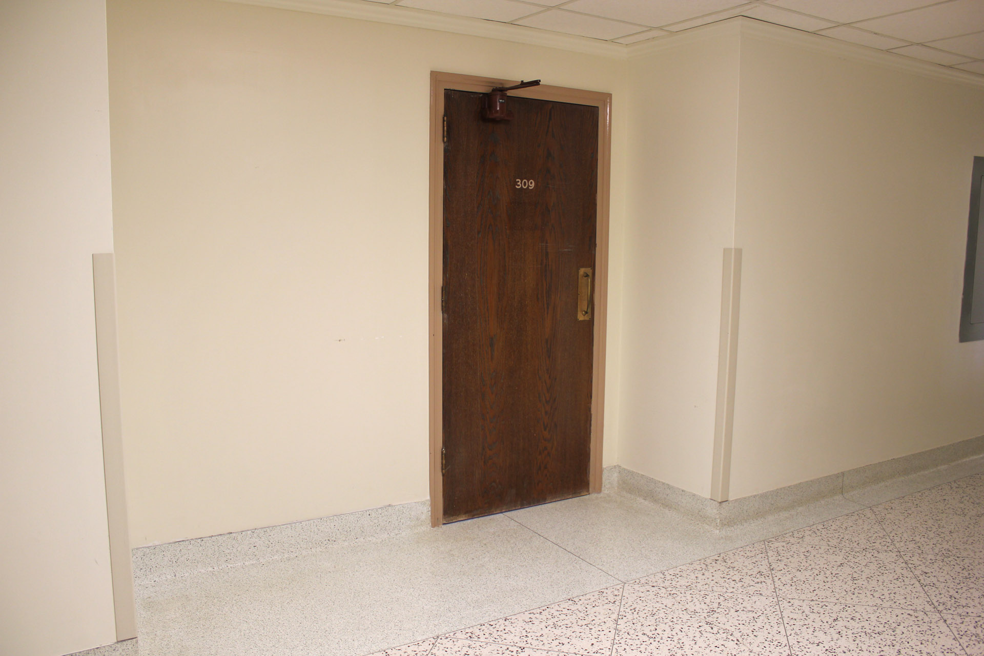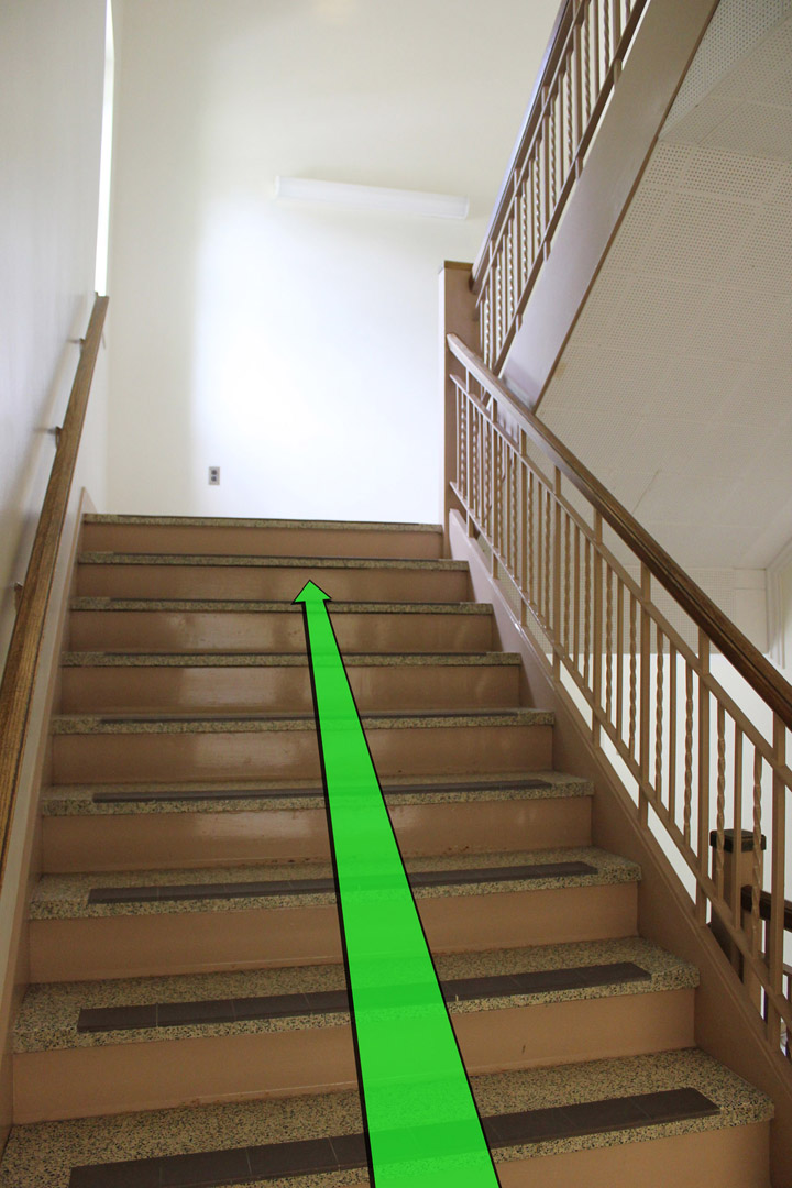 On entering the building walk towards the stairway doors on your left and enter the stairway.