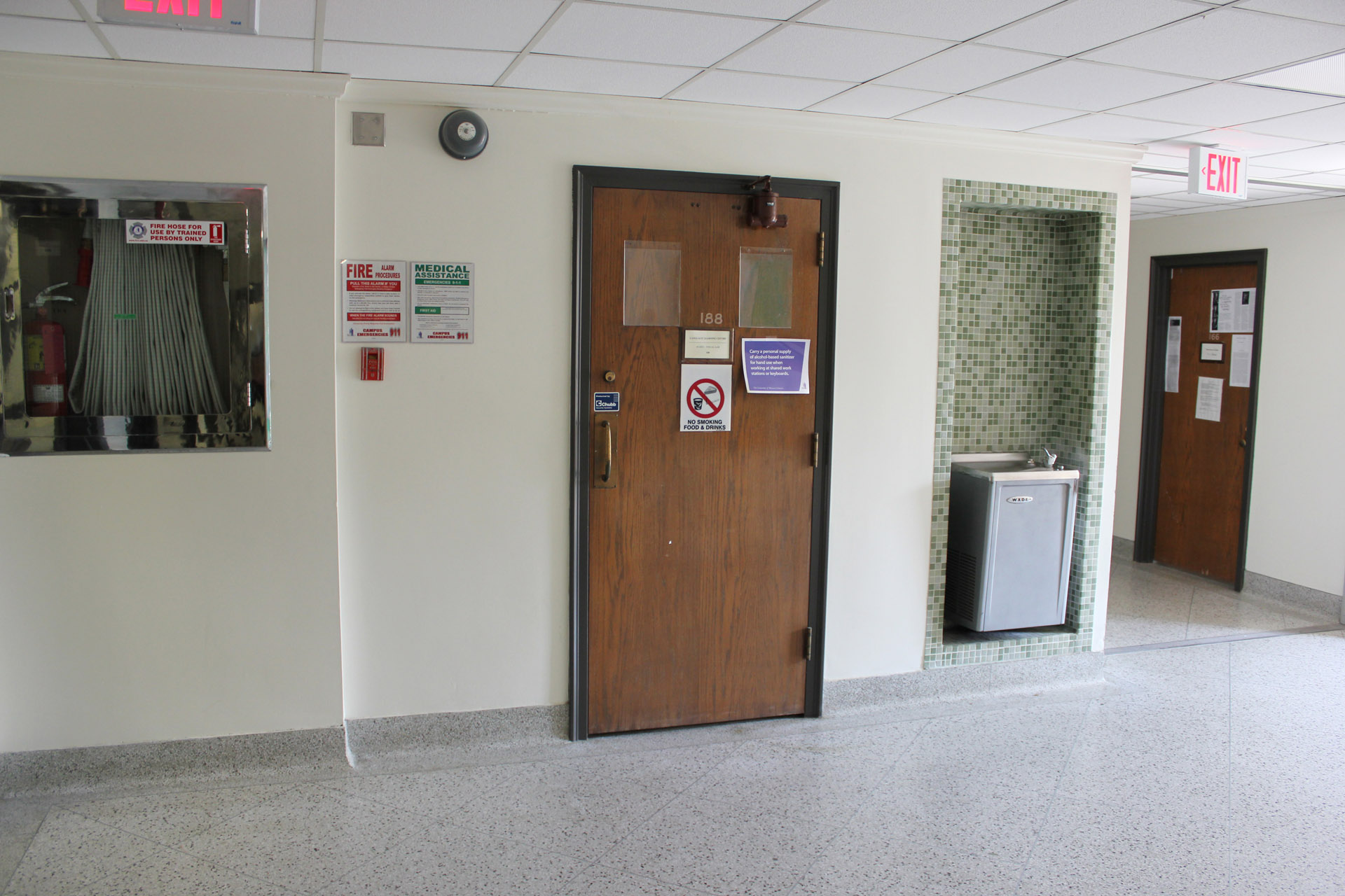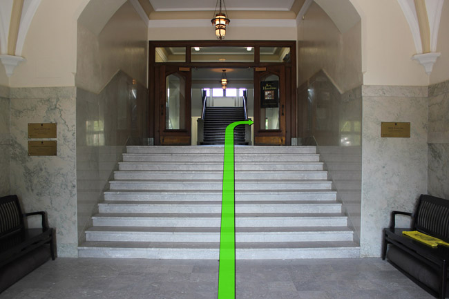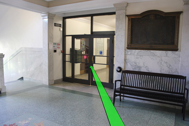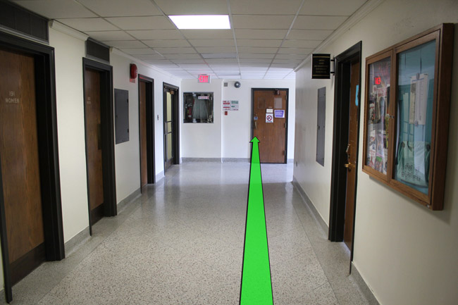 On entering the building walk up the stairs and take a right turn at the top of the staircase.