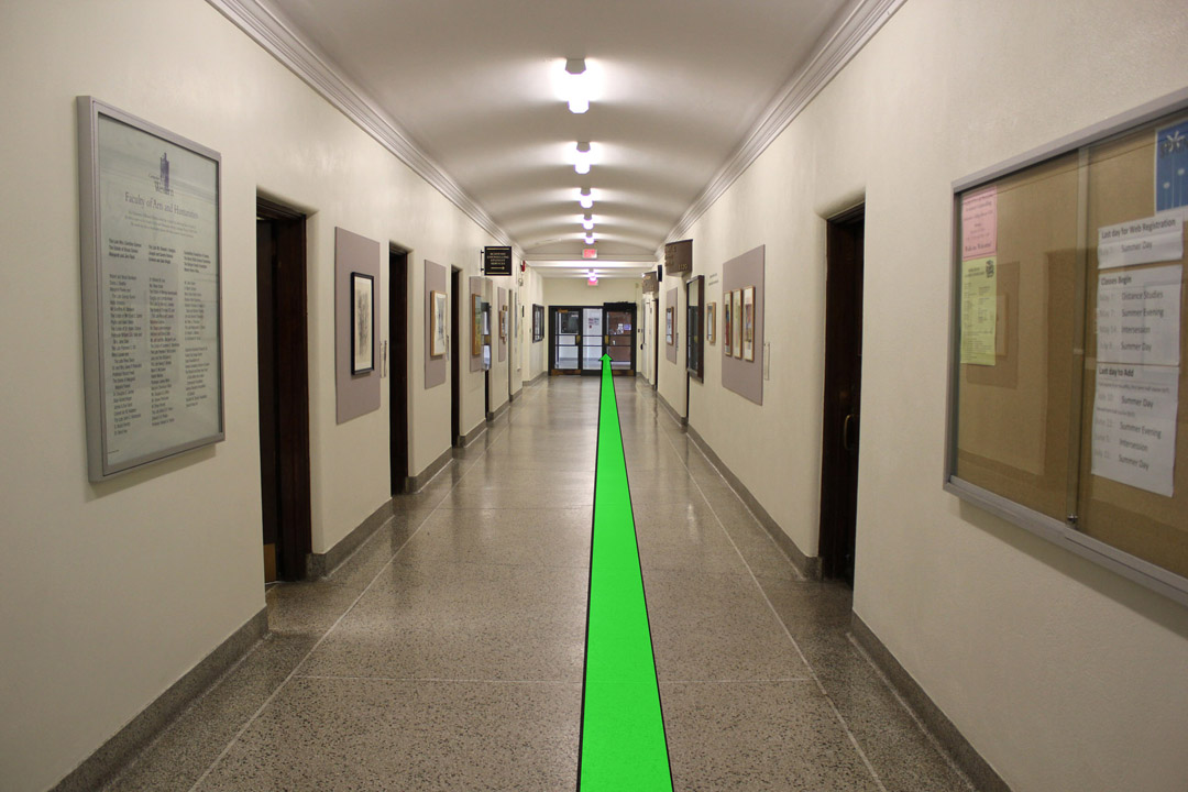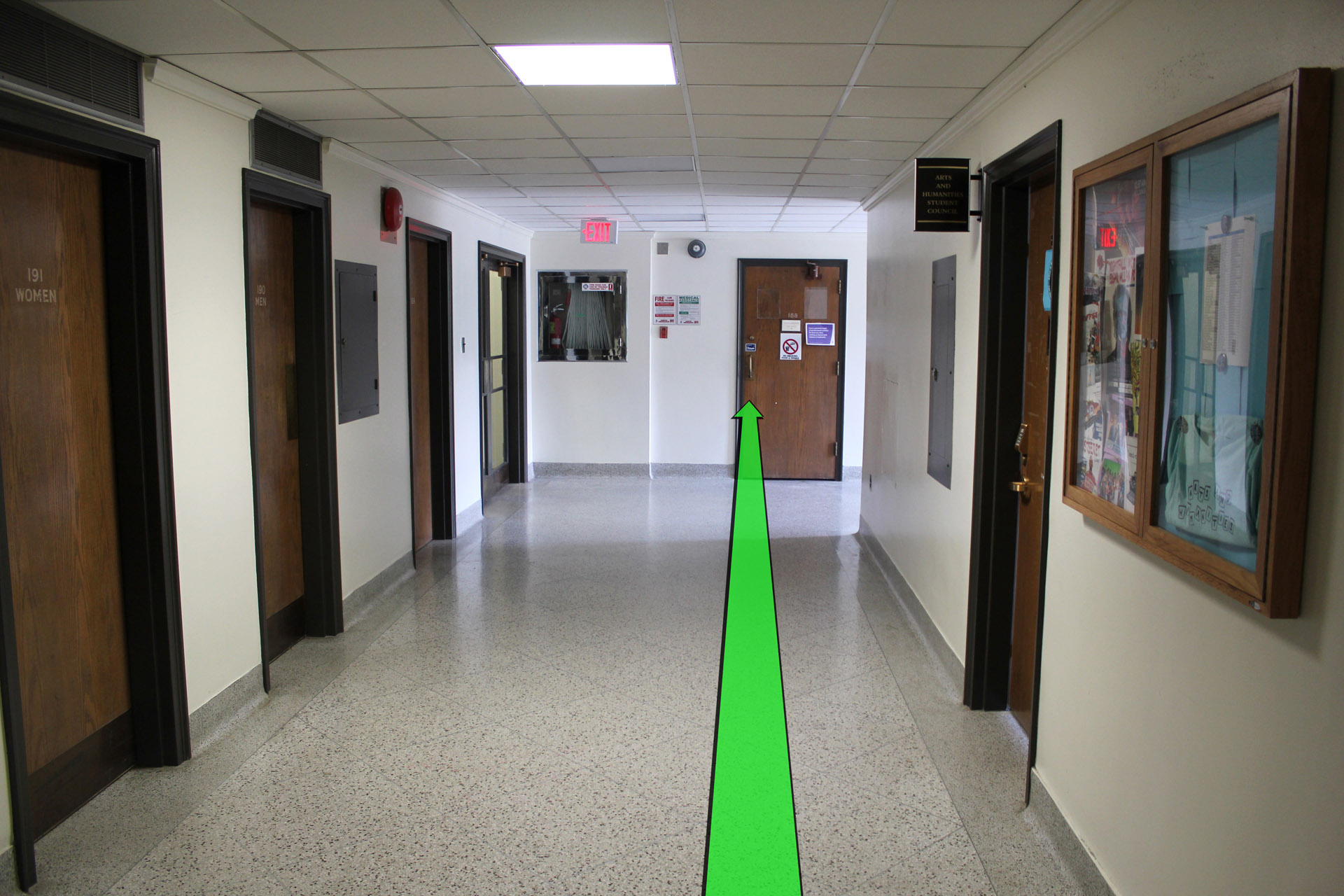 Walk straight down the hallway towards the hallway doors at the end of the hallway. Enter that hallway.