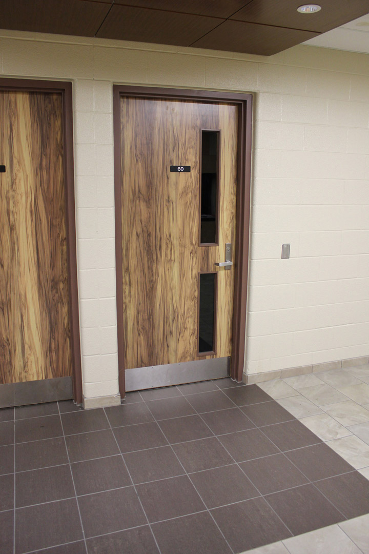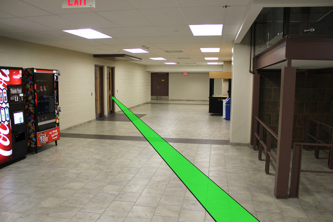 At the bottom of the stairway take a right turn and walk down the hallway.