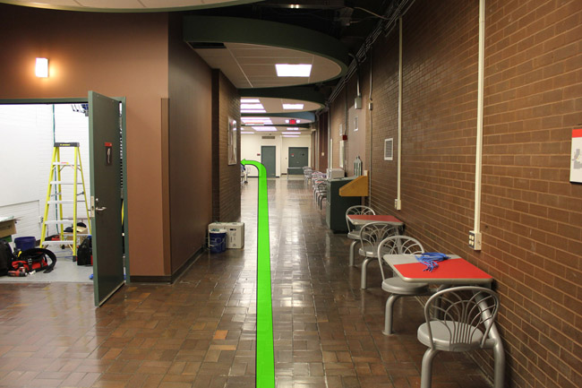 On your right, walk straight down the hallway and take a left turn up ahead.