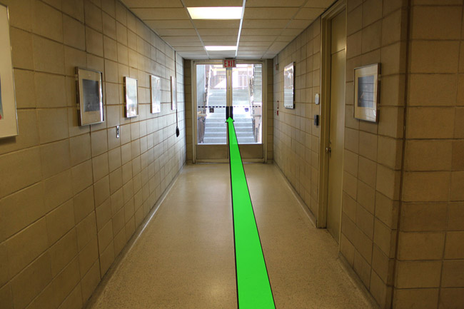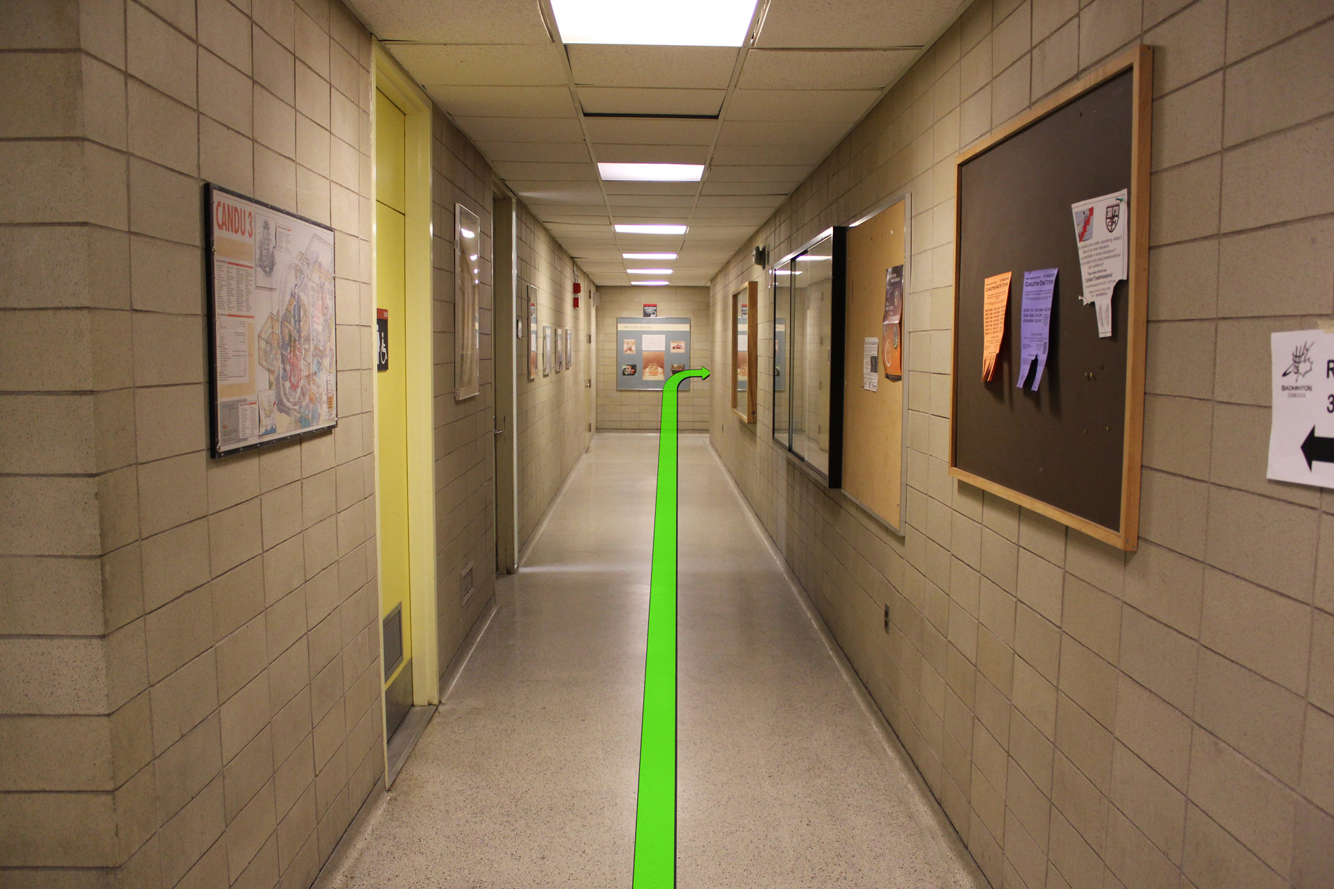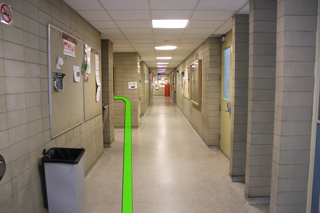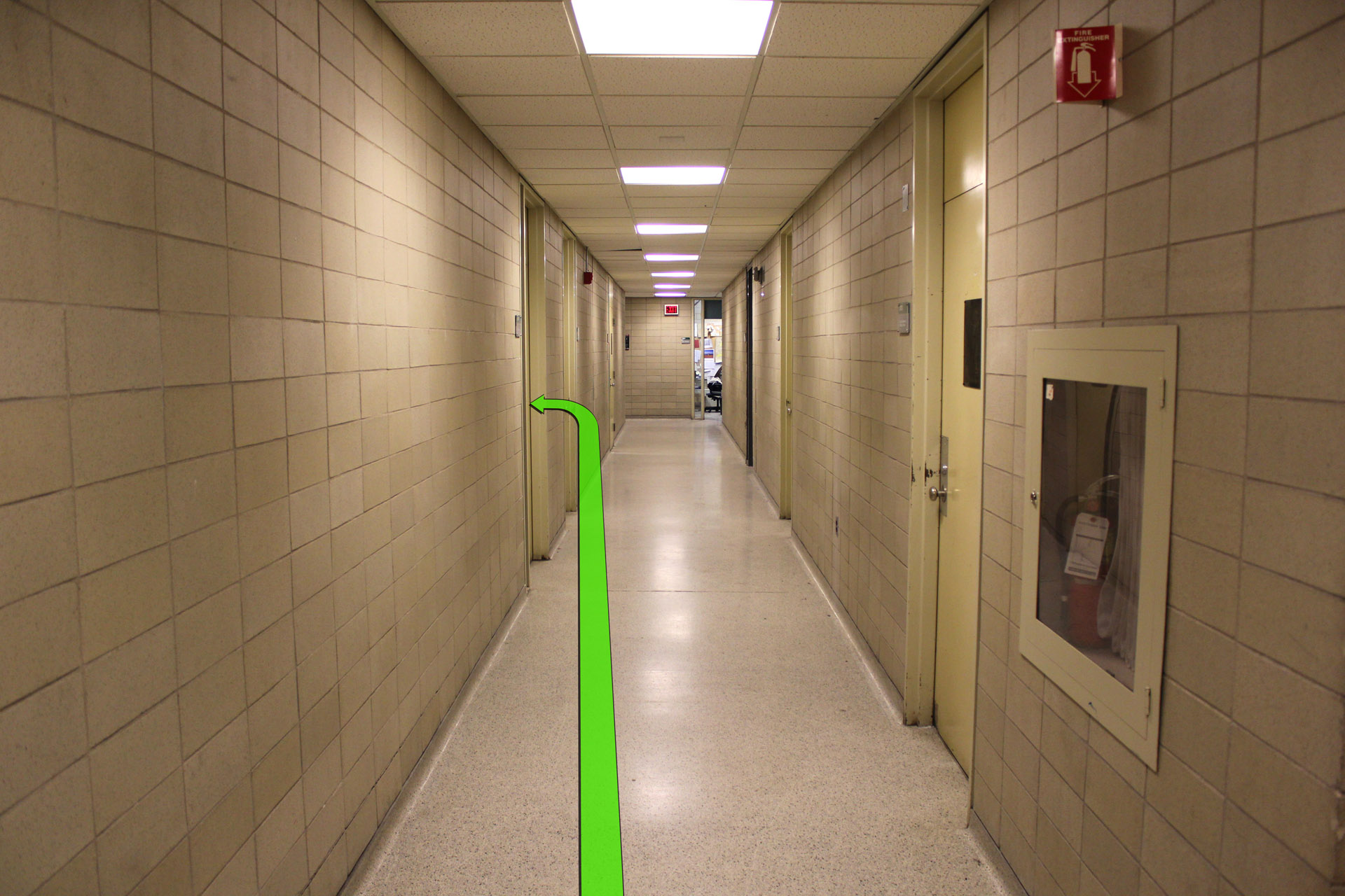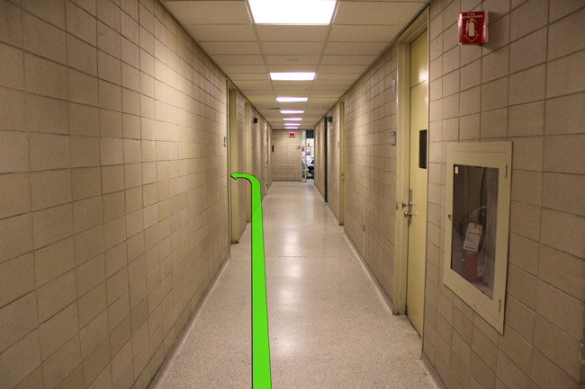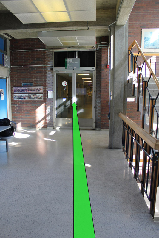 Walk straight down the hallway and take a right turn at the end of the hallway.
