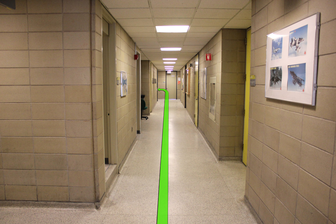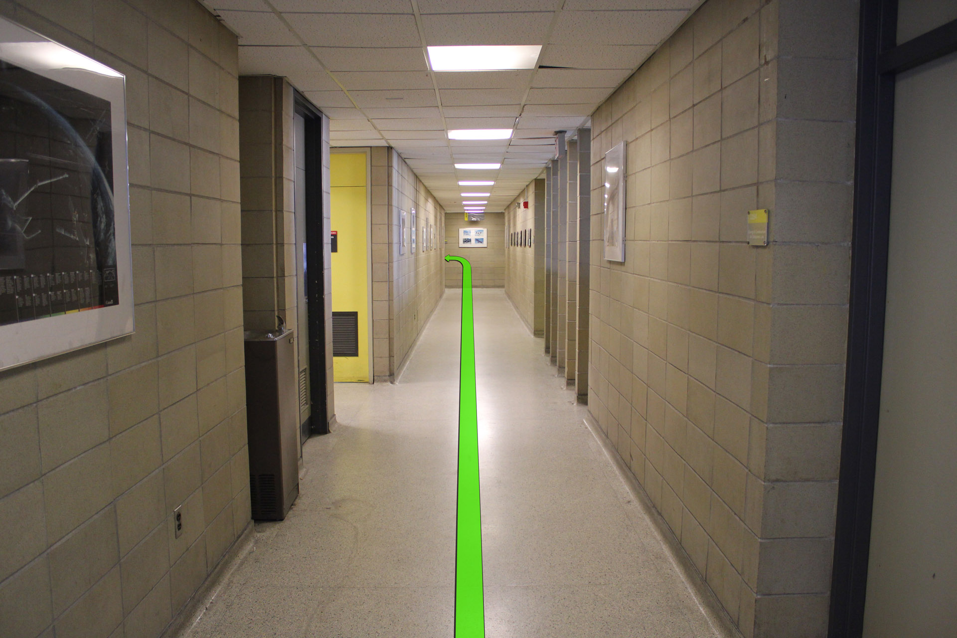 Walk straight down the hallway and take a left turn at the end of the hallway.
