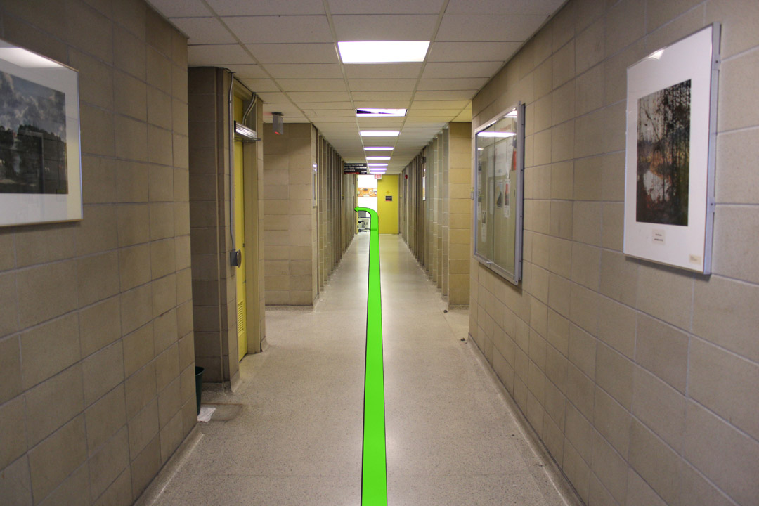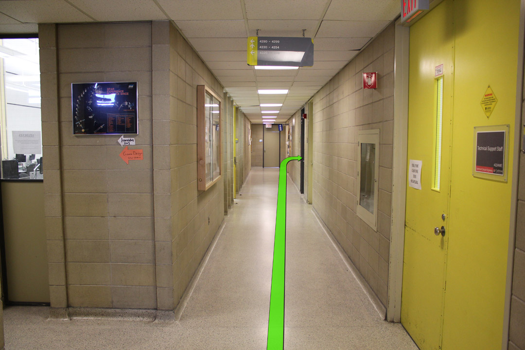 Walk straight down the hallway and take a left turn at the end of the hallway.