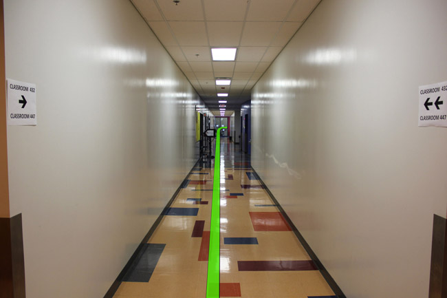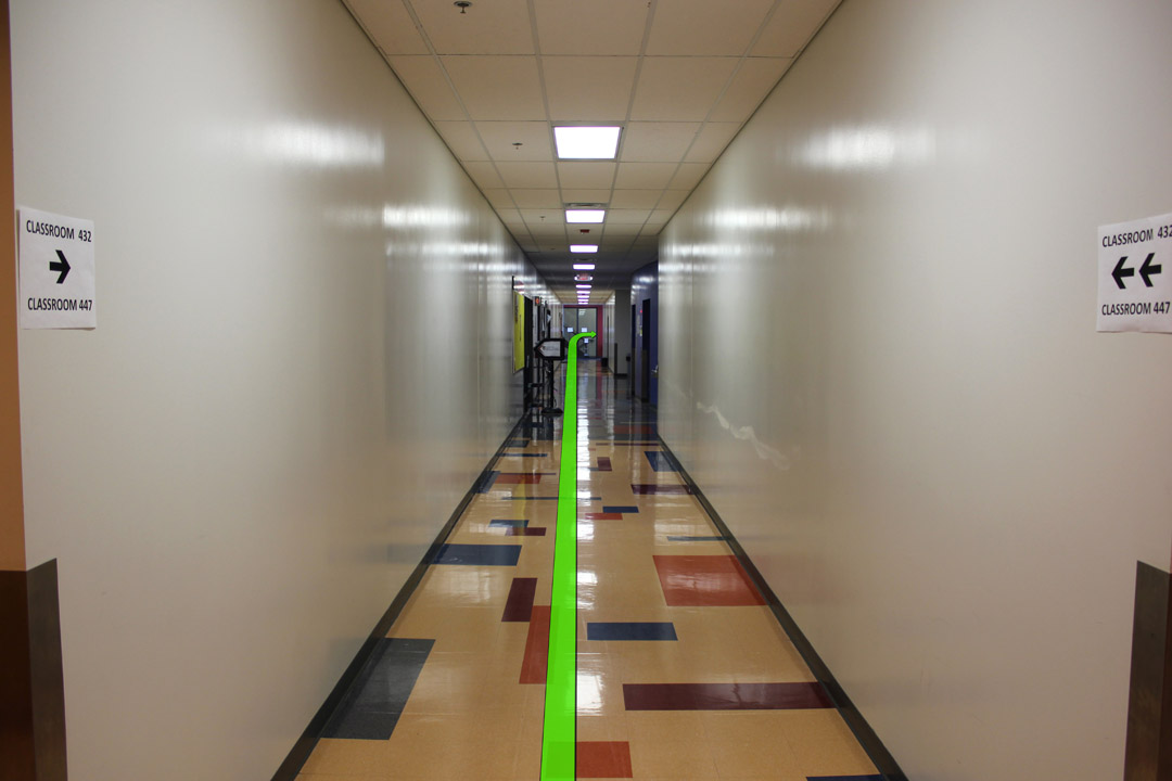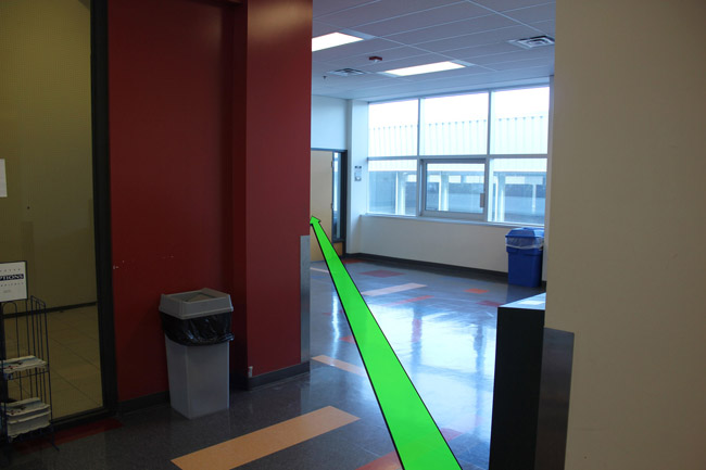 Walk straight down the hallway and take a right turn at the end of the hallway.