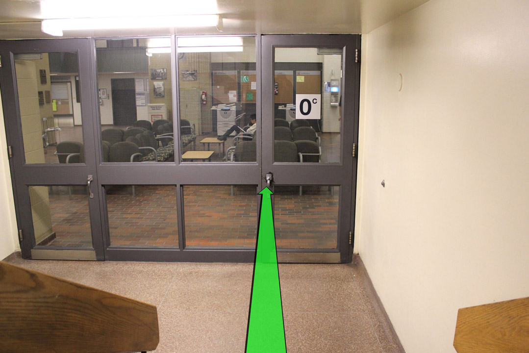 Walk towards the stairway door and enter the stairway.