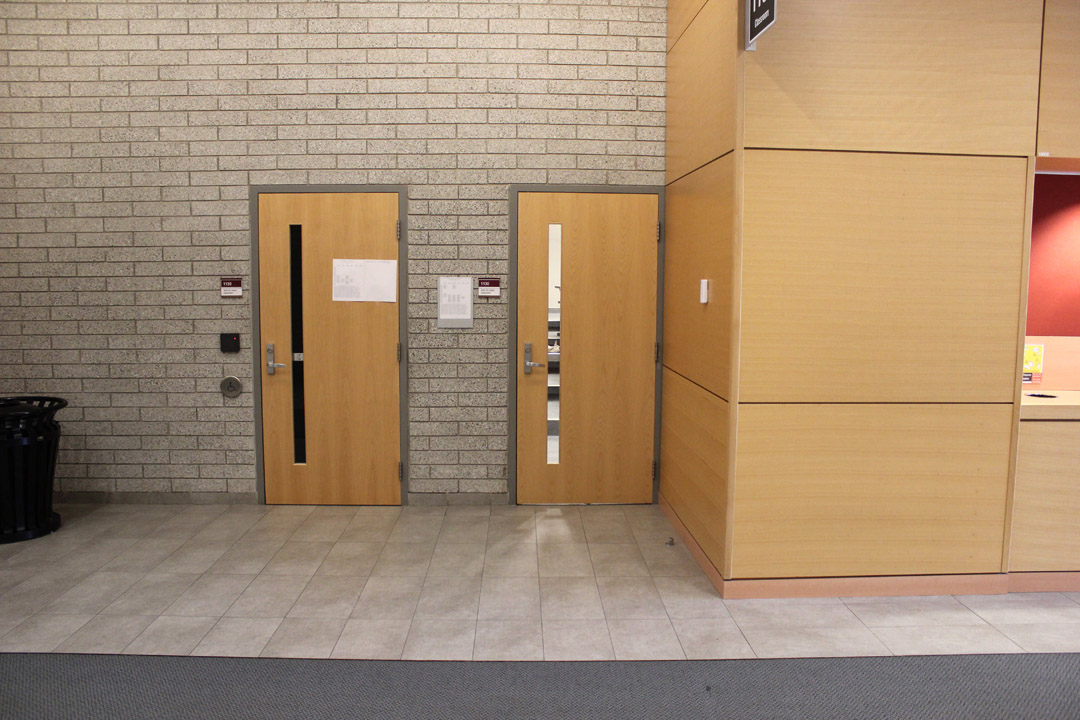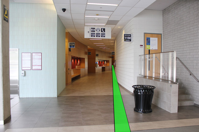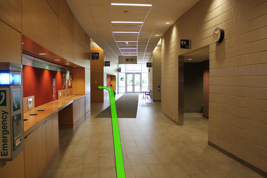 Walk straight down the hallway and take a right turn at the first hallway on your right.