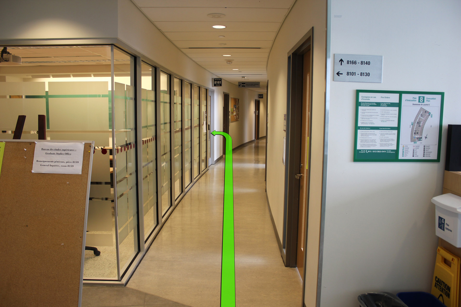 Take the elevator to the 8th floor.