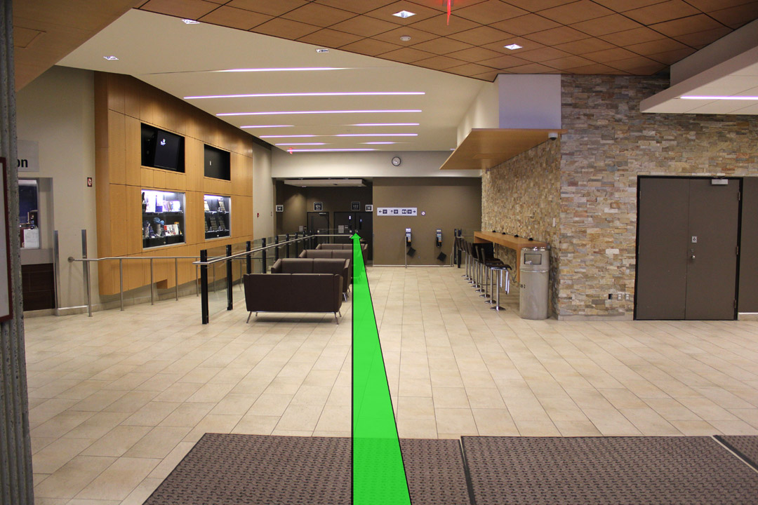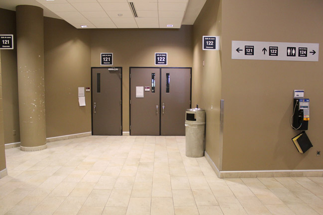 Walk from Jean Jacques Lussier towards the Lamoureux Hall entrance.