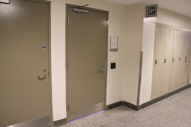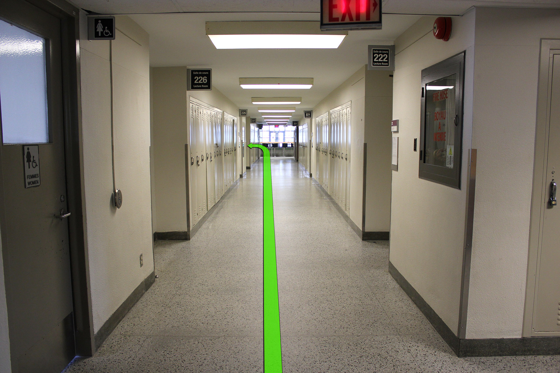 Walk towards the set of hallway doors and enter the hallway.