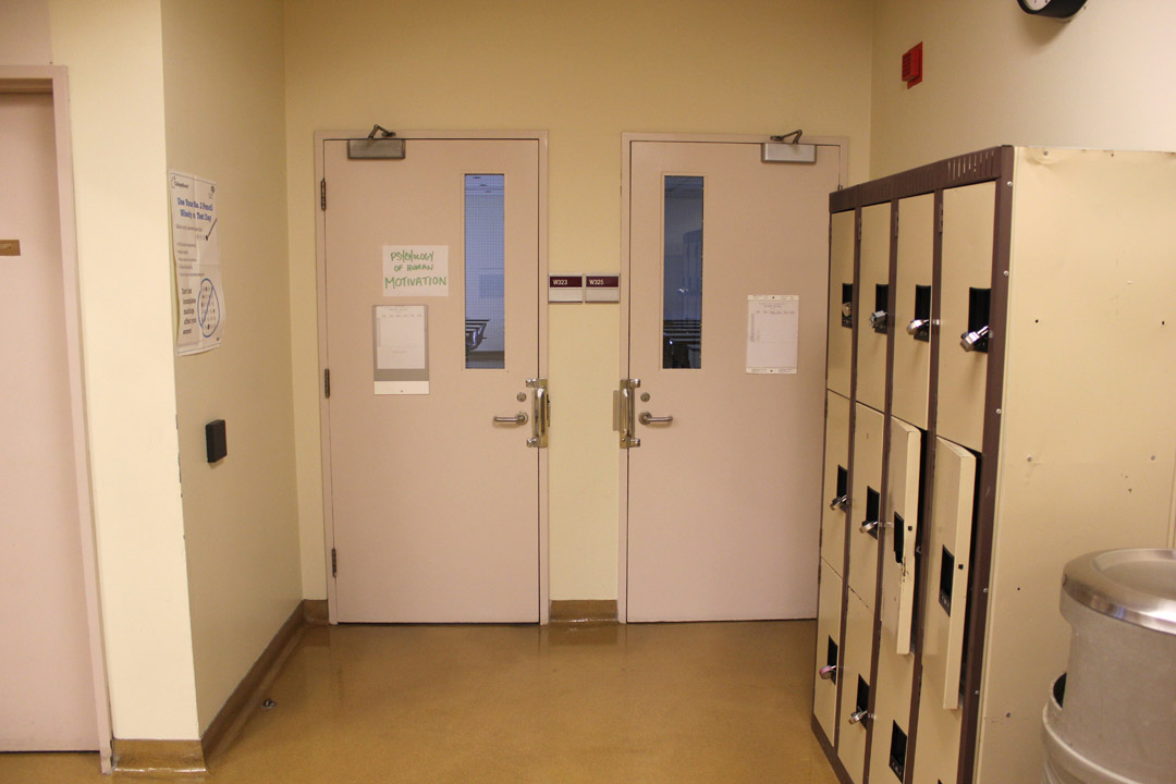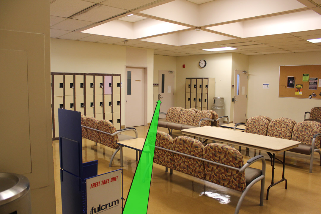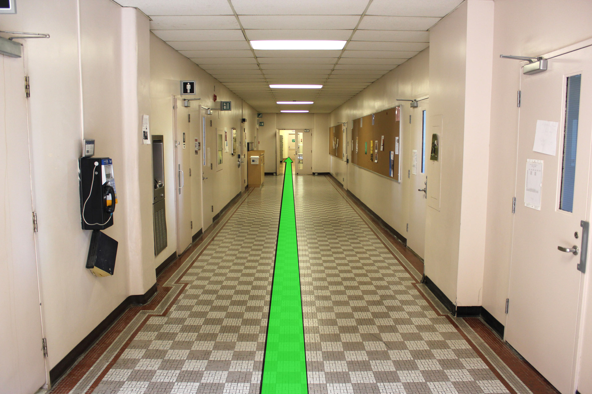 Walk straight down the hallway past the set of hallway doors.