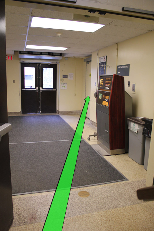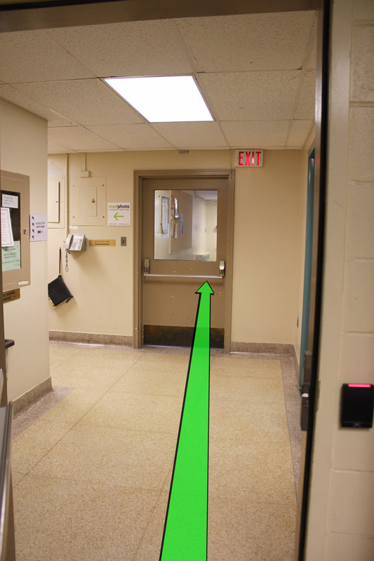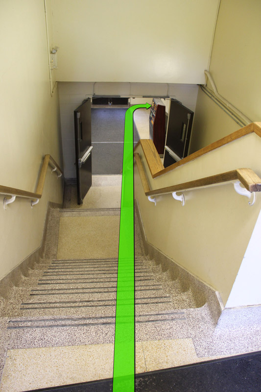 On entering the building, walk downstairs and take a right turn through the door up ahead.