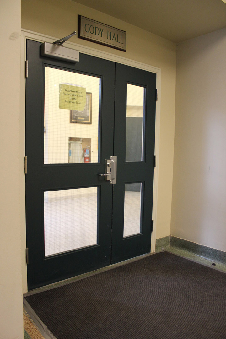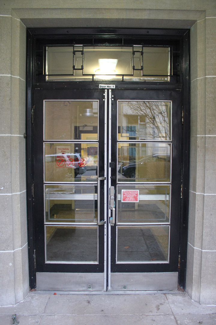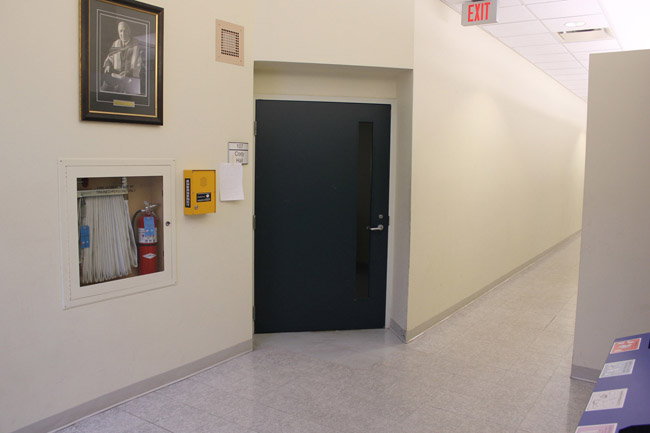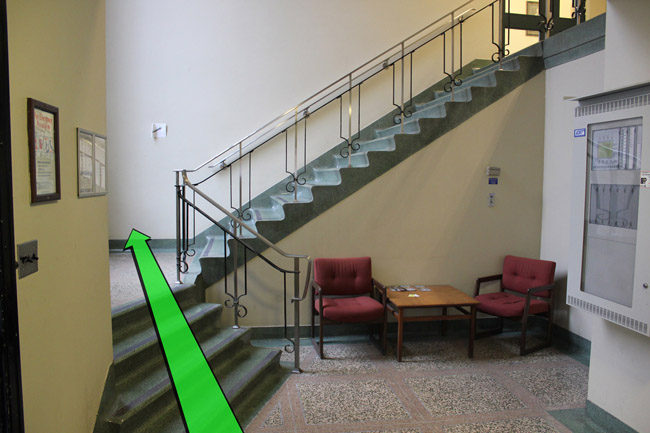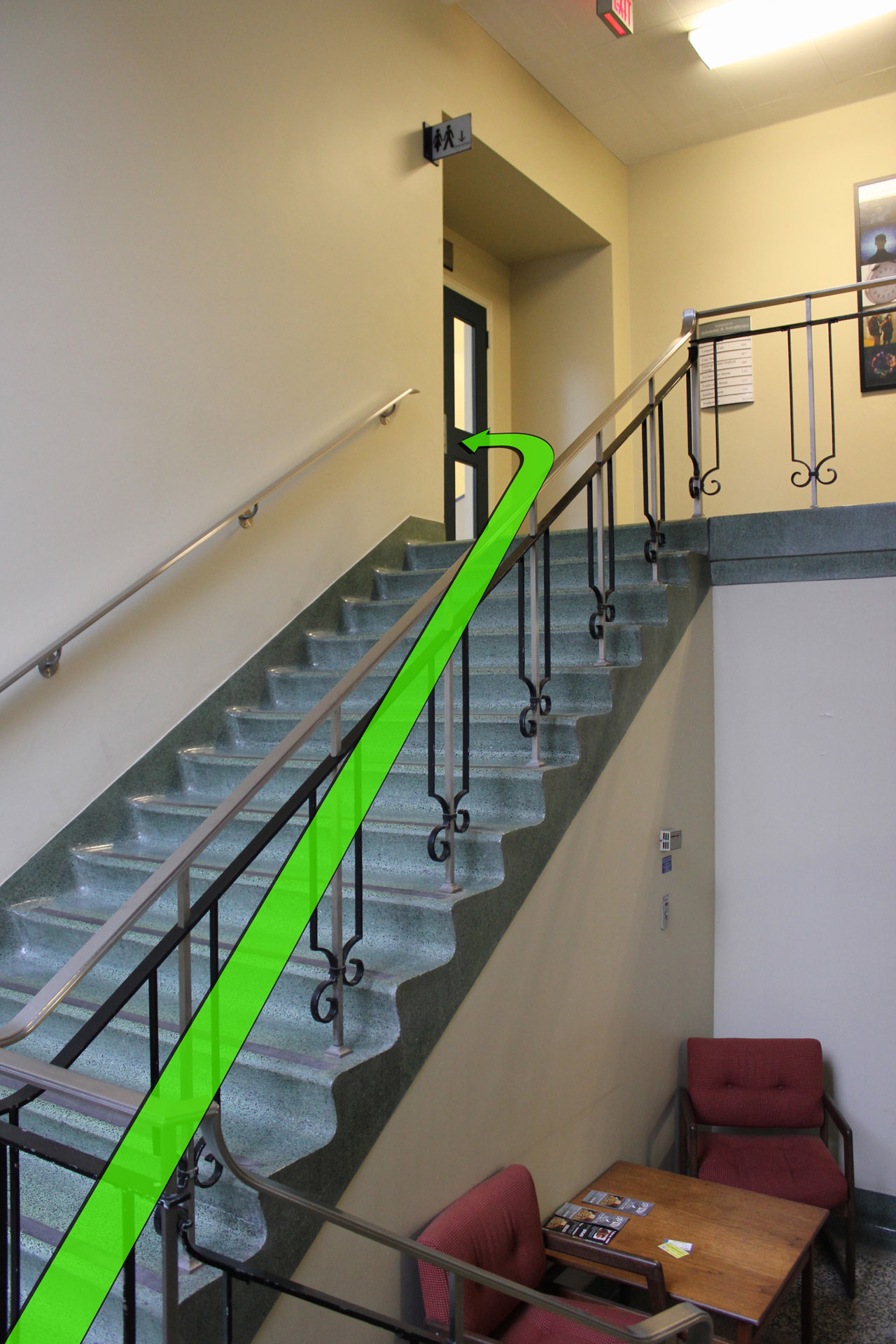 Walk up the stairs towards the 1st floor hallway doors on the left.