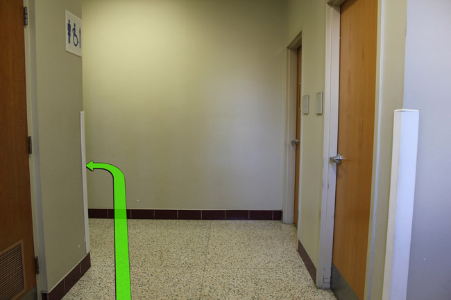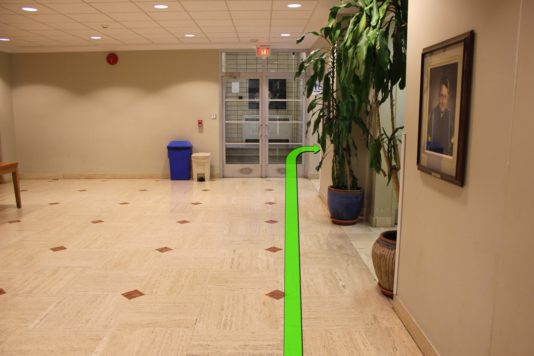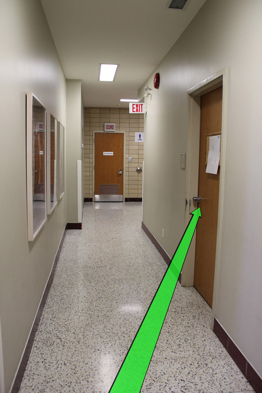 Walk down the hallway and at the end of the hallway take a right turn.
