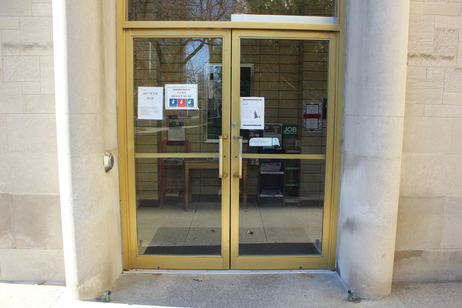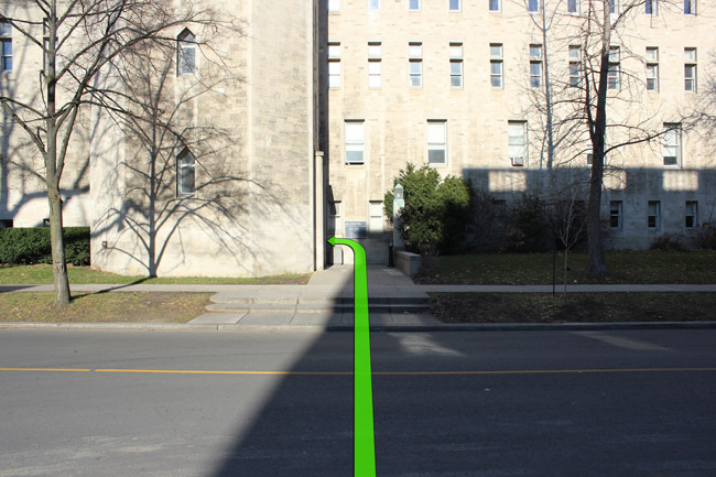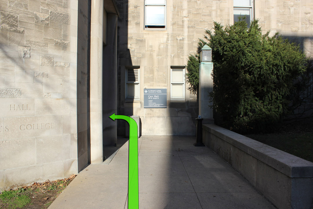 Walk from St. Joseph Street towards the entrance of Carr Hall.