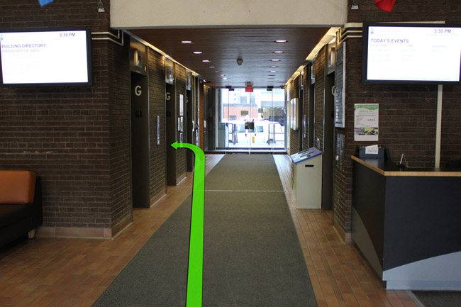 On entering the building walk towards the elevator and take the elevator to the 5th floor.