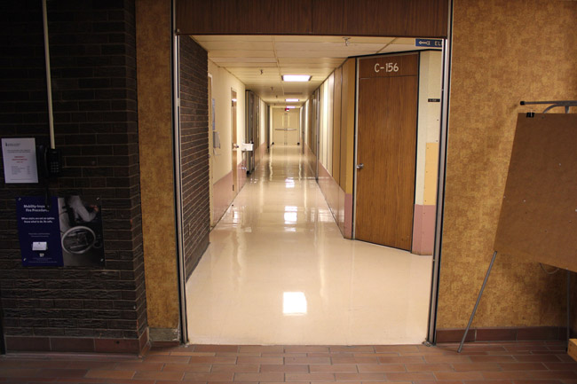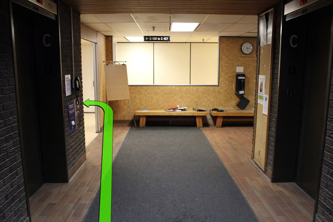 On entering the building walk towards the elevator and take the elevator to the Cellar (C) Floor.