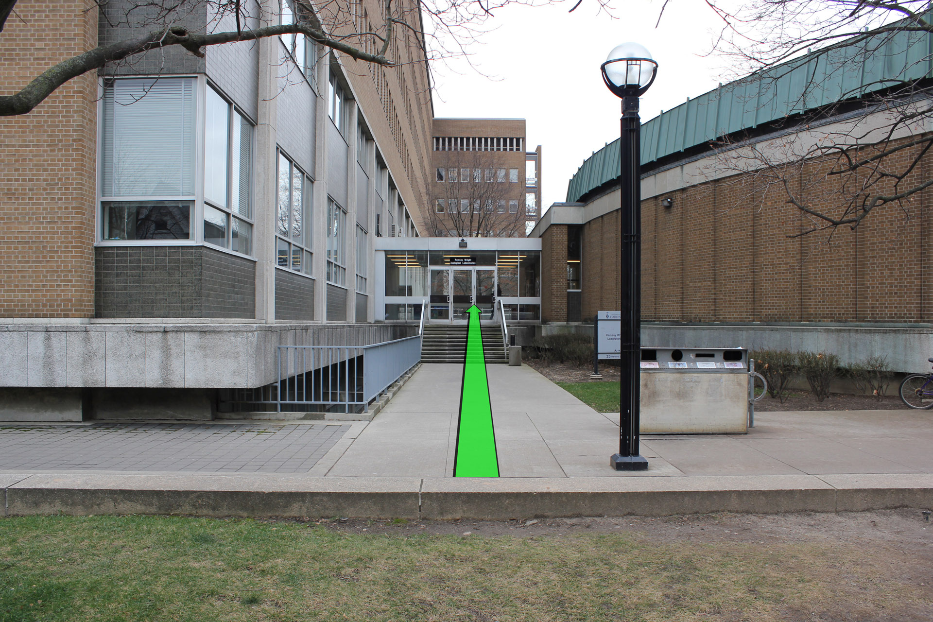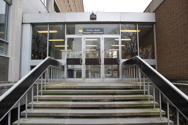 Walk from St. George Street towards the entrance of the Ramsay Wright Laboratories.