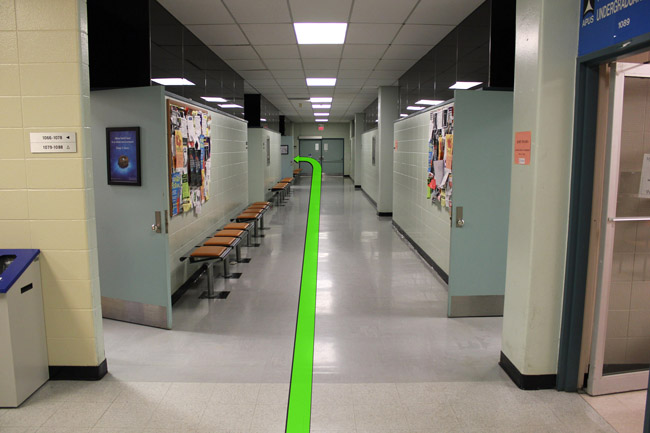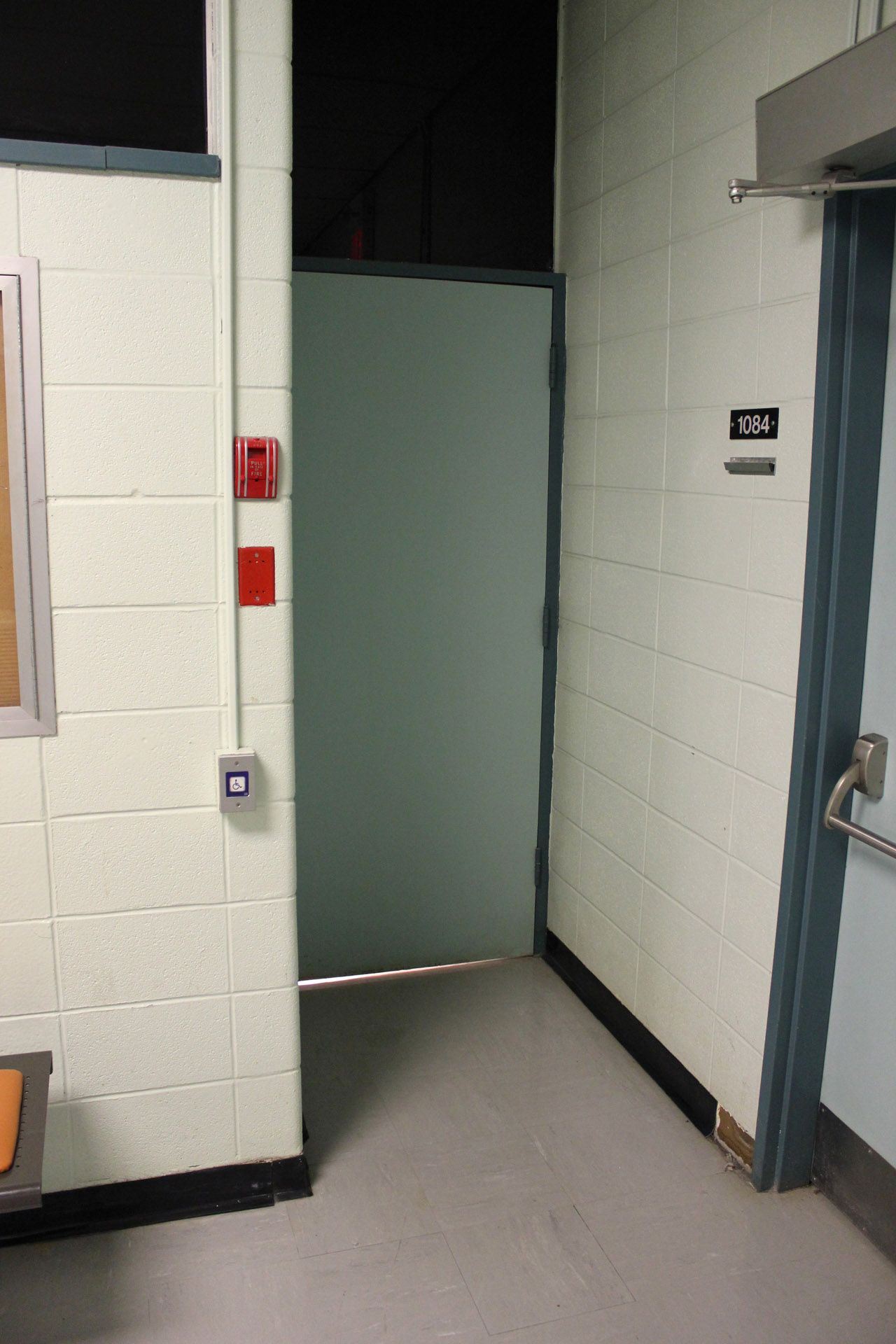 On entering the building walk straight towards the stairway doors on the left. Enter the stairway.