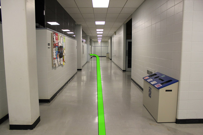 Walk down the hallway on your left and take a right turn at the hallway up ahead.