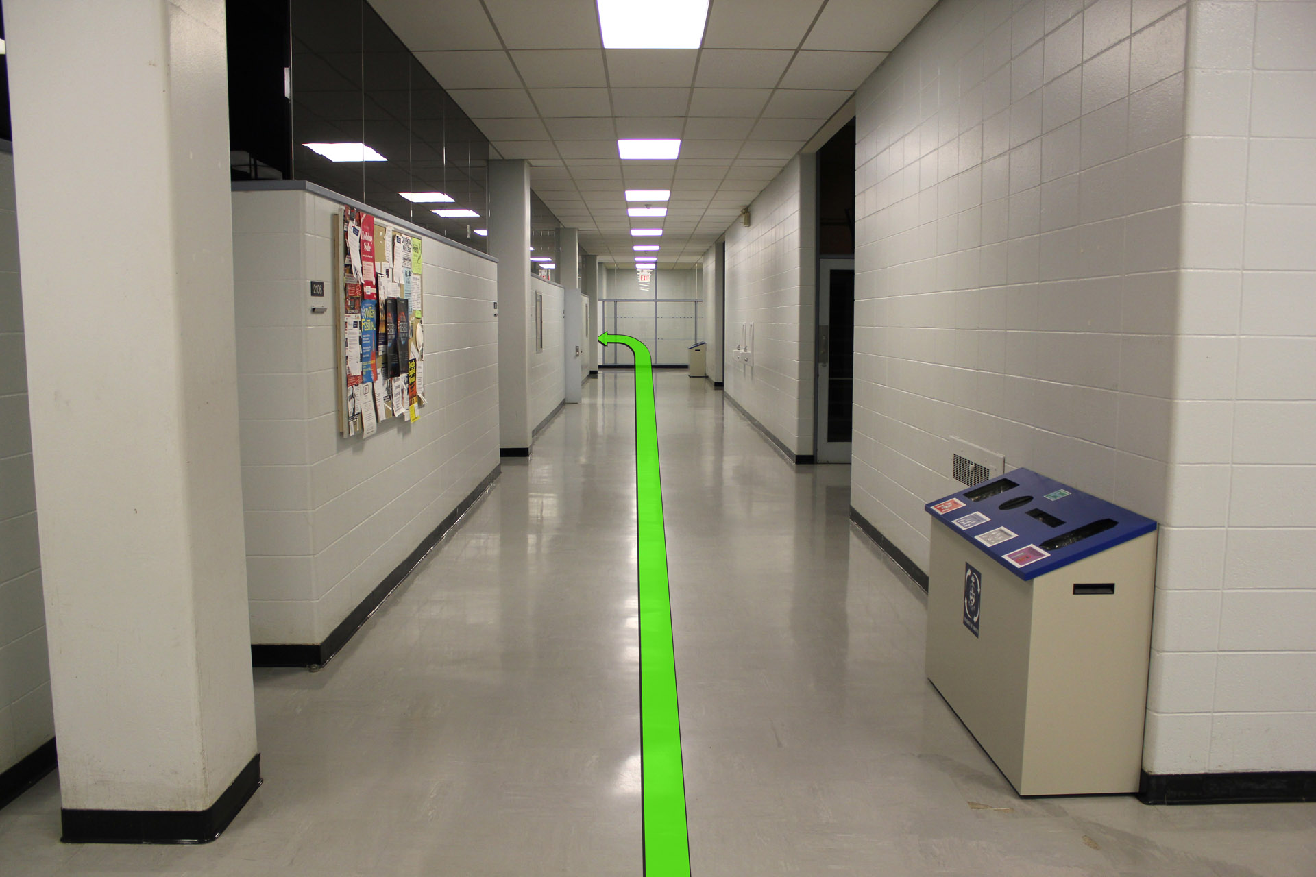 Walk straight down the hallway.